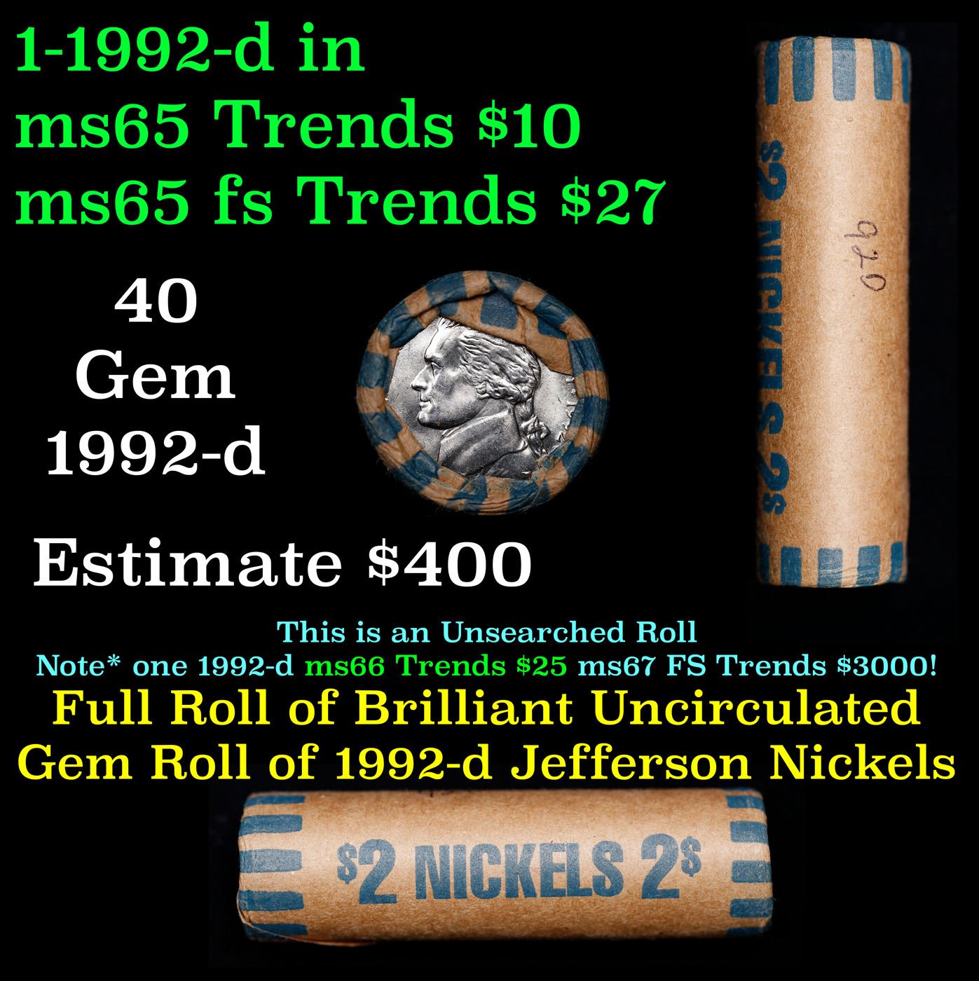 Shotgun Jefferson 5c roll, 1992-p 40 pcs Vintage Bank Wrapper. A terrific Shotgun roll of unsearched Jefferson nickles. Most if not all coins should be gem or better