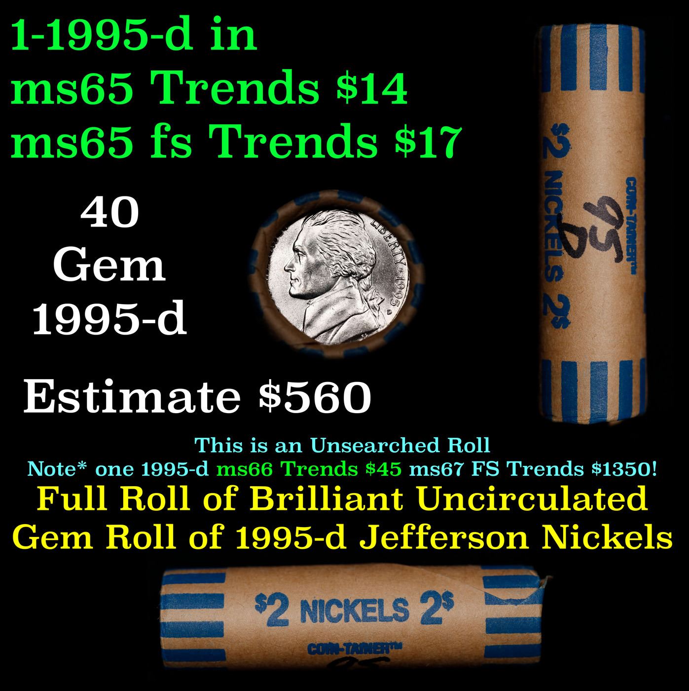 Shotgun Jefferson 5c roll, 1995-d 40 pcs Coin-Tainer Wrapper. A terrific Shotgun roll of unsearched Jefferson nickles. Most if not all coins should be gem or better