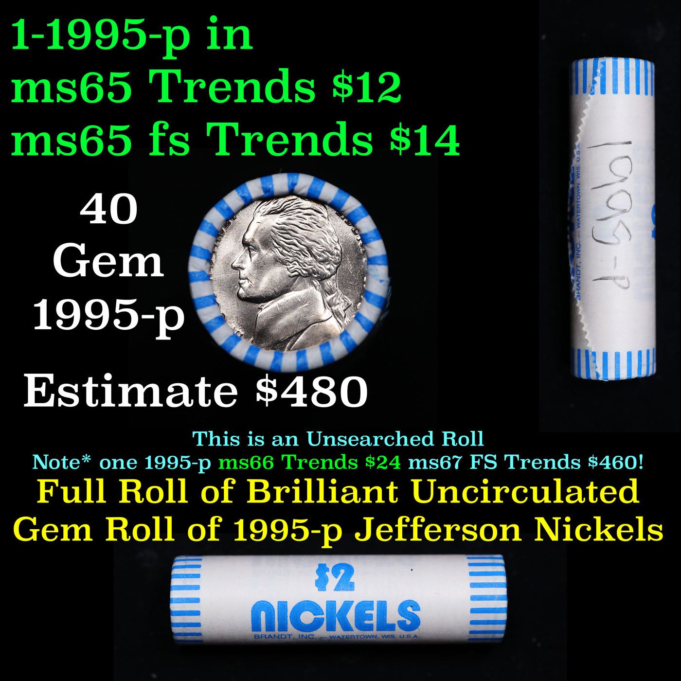 Shotgun Jefferson 5c roll, 1995-p 40 pcs Brandt Wrapper. A terrific Shotgun roll of unsearched Jefferson nickles. Most if not all coins should be gem or better