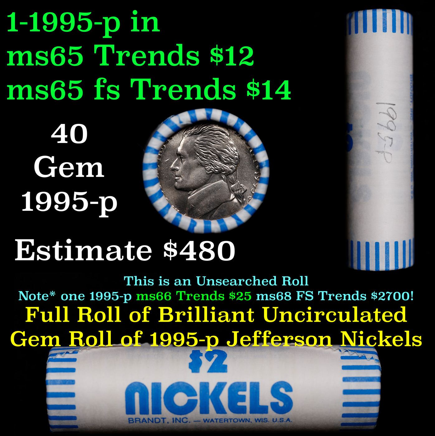 Shotgun Jefferson 5c roll, 1995-p 40 pcs Brandt Wrapper. A terrific Shotgun roll of unsearched Jefferson nickles. Most if not all coins should be gem or better