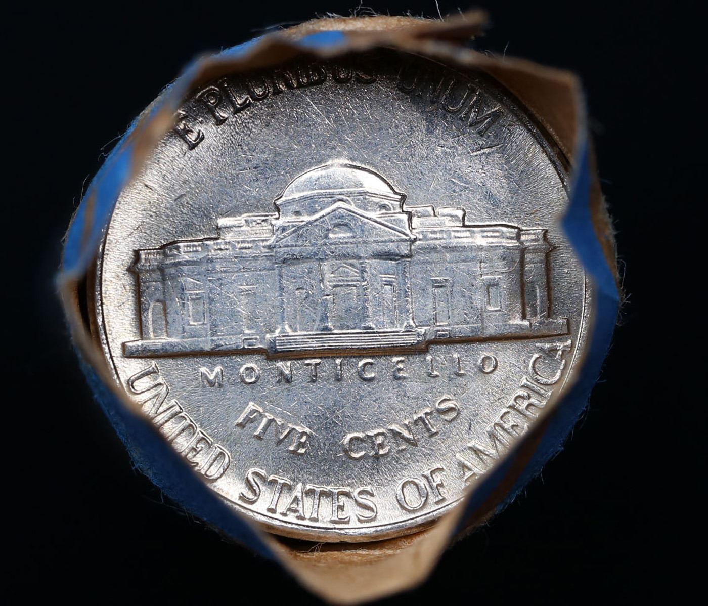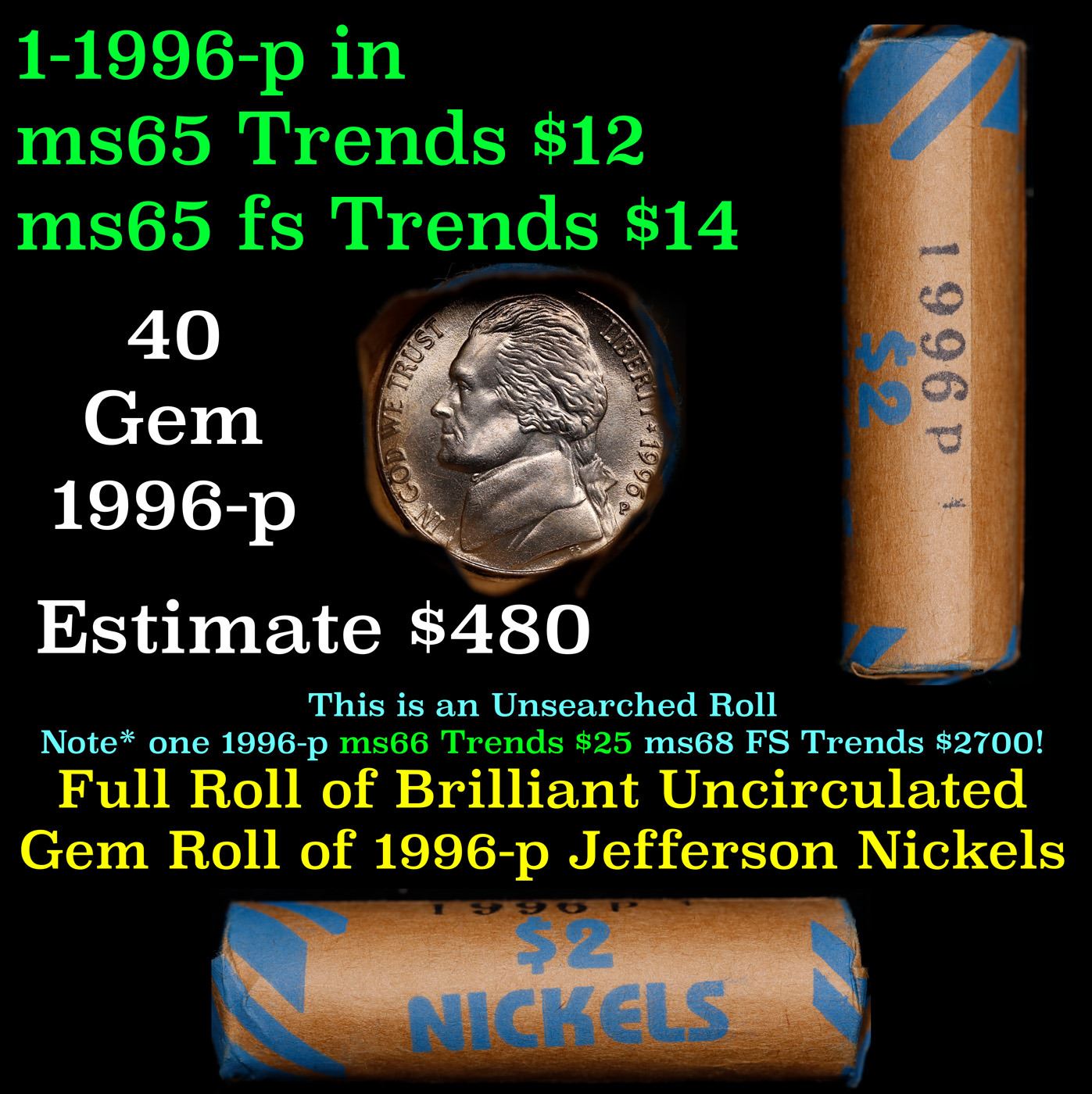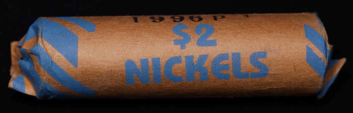 Shotgun Jefferson 5c roll, 1996-p 40 pcs Bank Wrapper. A terrific Shotgun roll of unsearched Jefferson nickles. Most if not all coins should be gem or better