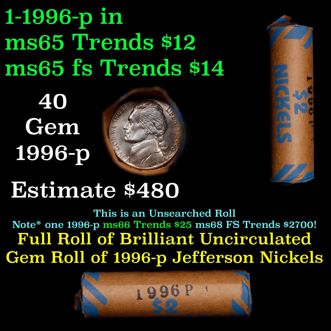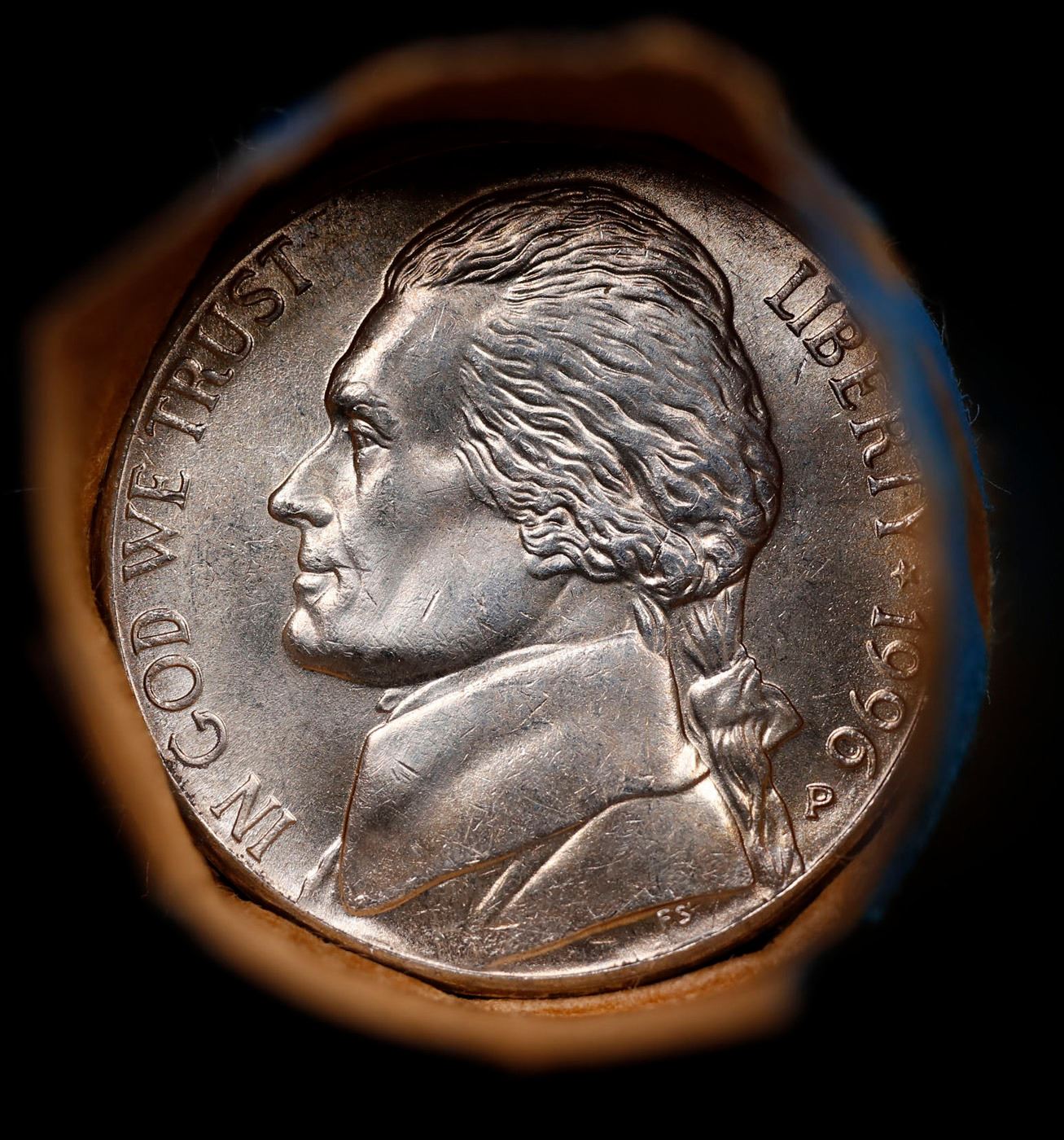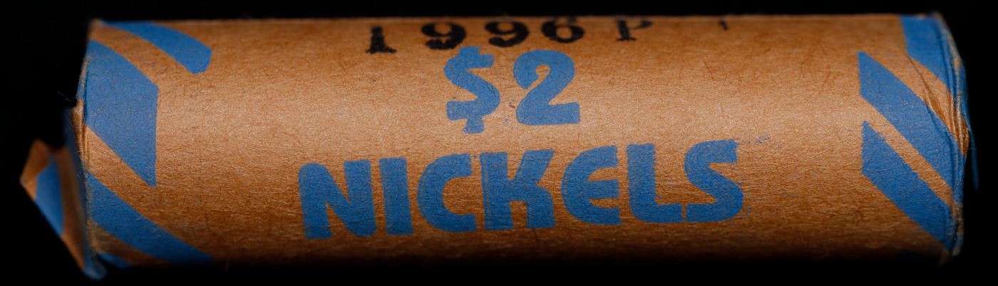 Shotgun Jefferson 5c roll, 1996-p 40 pcs Vintage Bank Wrapper. A terrific Shotgun roll of unsearched Jefferson nickles. Most if not all coins should be gem or better