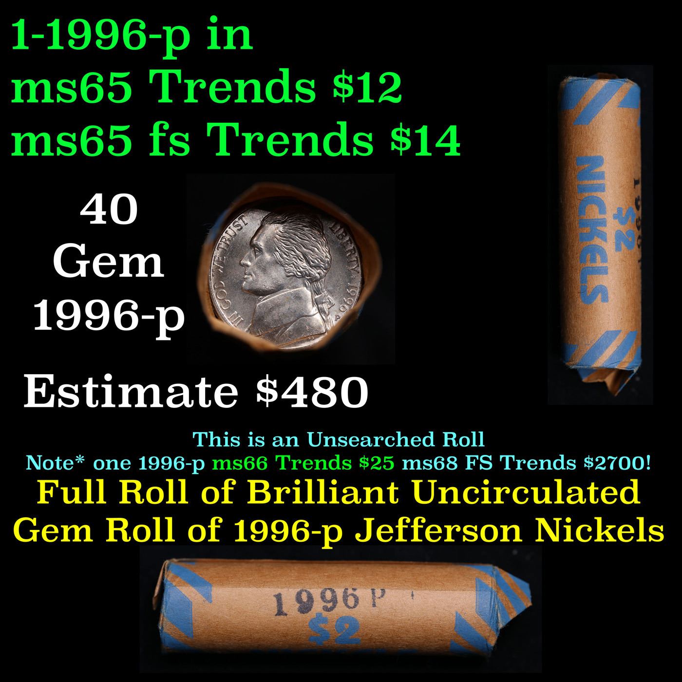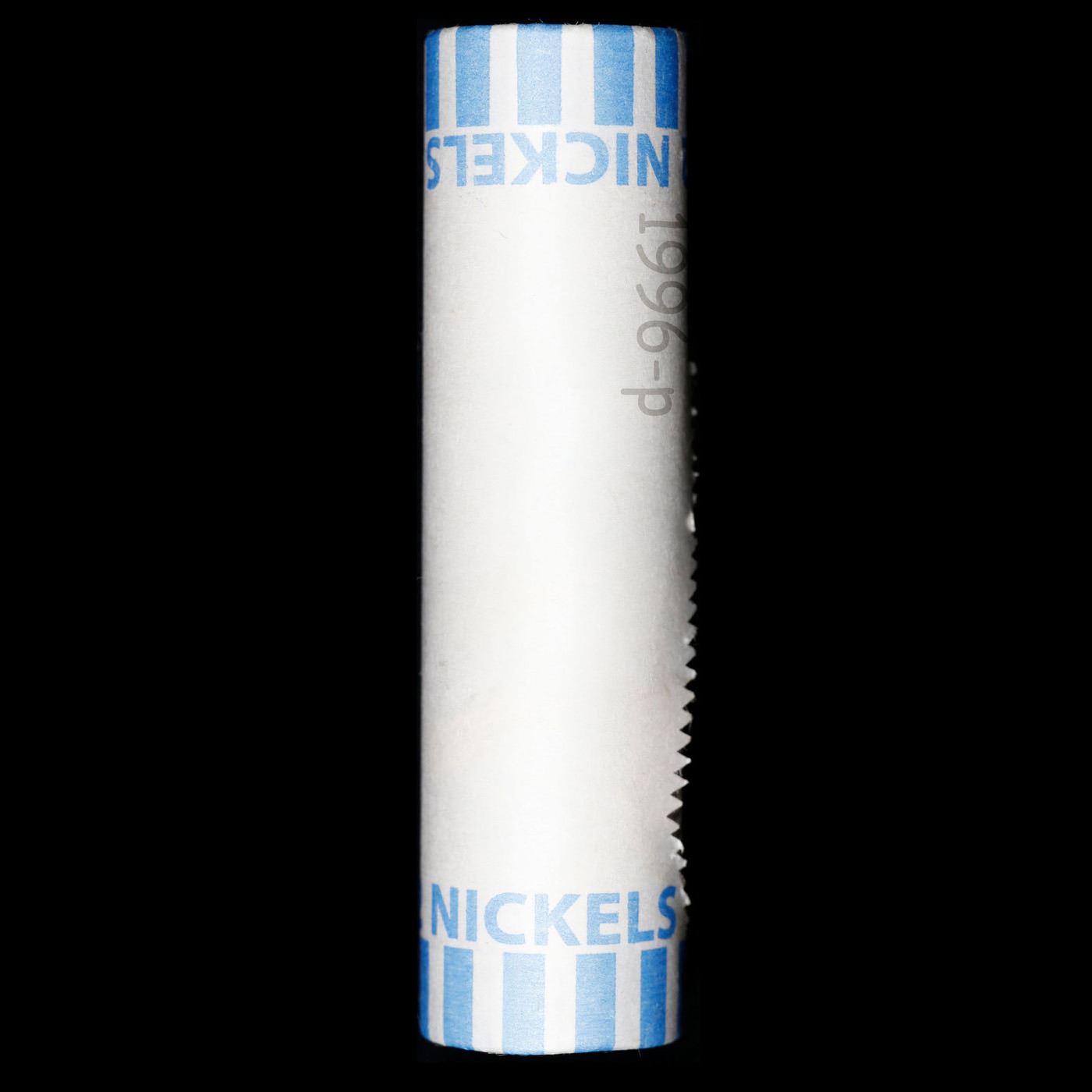 Shotgun Jefferson 5c roll, 1996-p 40 pcs Vintage Bank Wrapper. A terrific Shotgun roll of unsearched Jefferson nickles. Most if not all coins should be gem or better