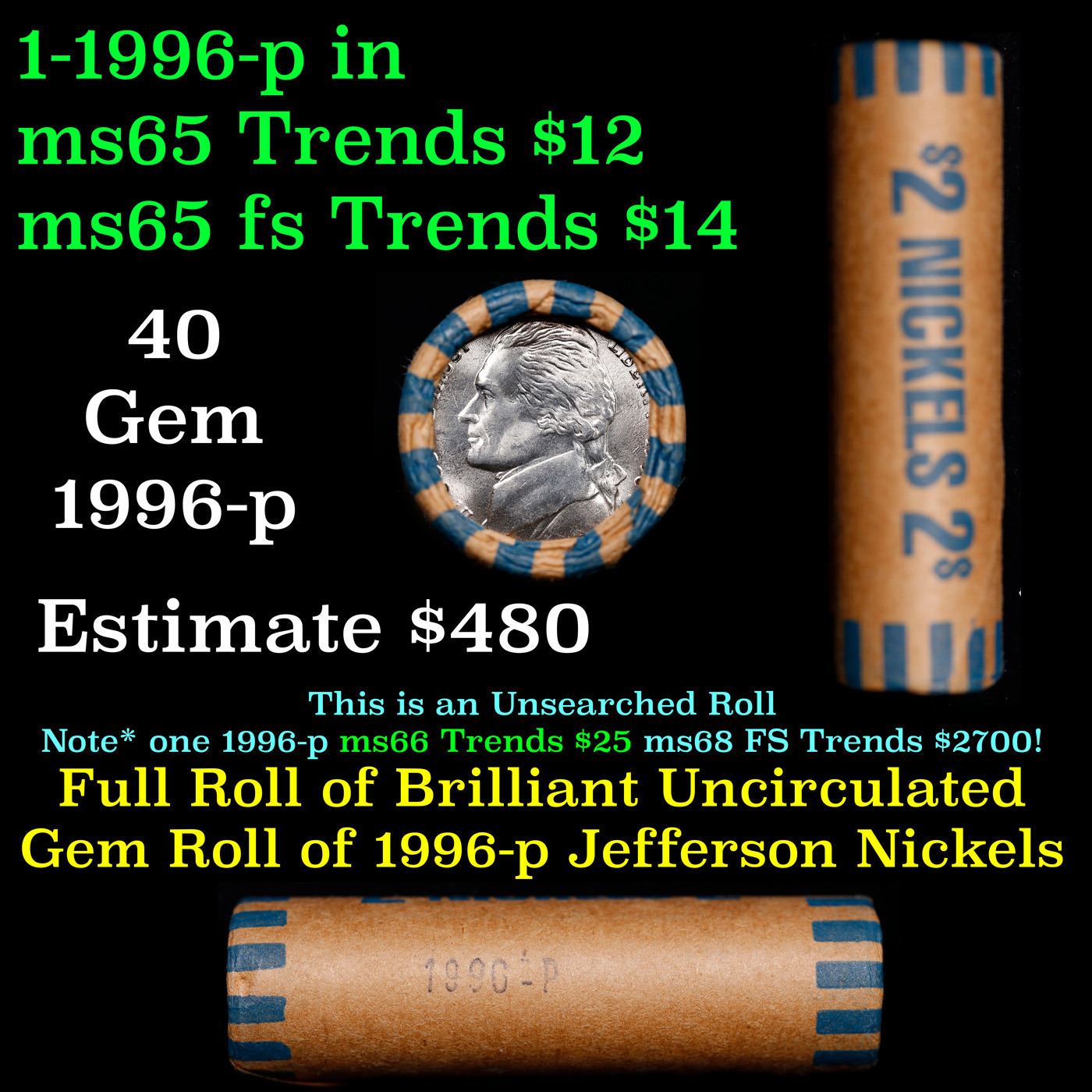 Shotgun Jefferson 5c roll, 1996-p 40 pcs Vintage Bank Wrapper. A terrific Shotgun roll of unsearched Jefferson nickles. Most if not all coins should be gem or better