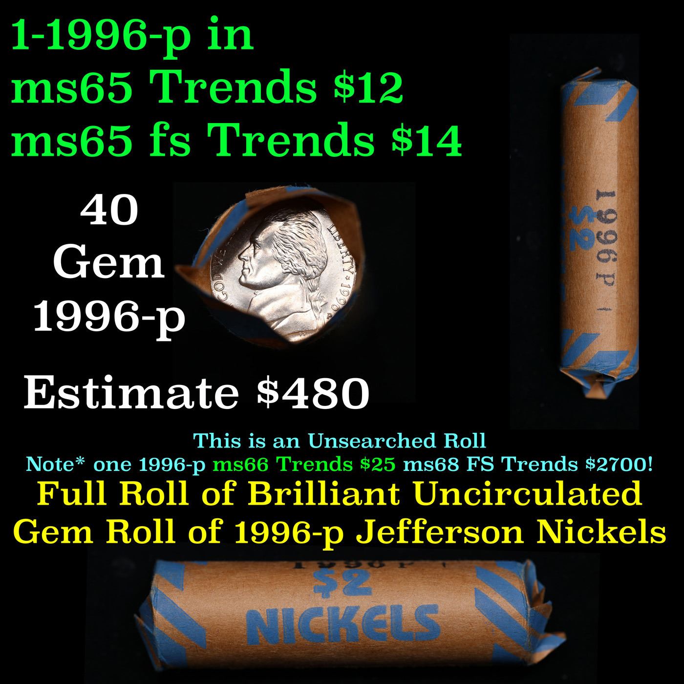 Shotgun Jefferson 5c roll, 1996-p 40 pcs Vintage Bank Wrapper. A terrific Shotgun roll of unsearched Jefferson nickles. Most if not all coins should be gem or better