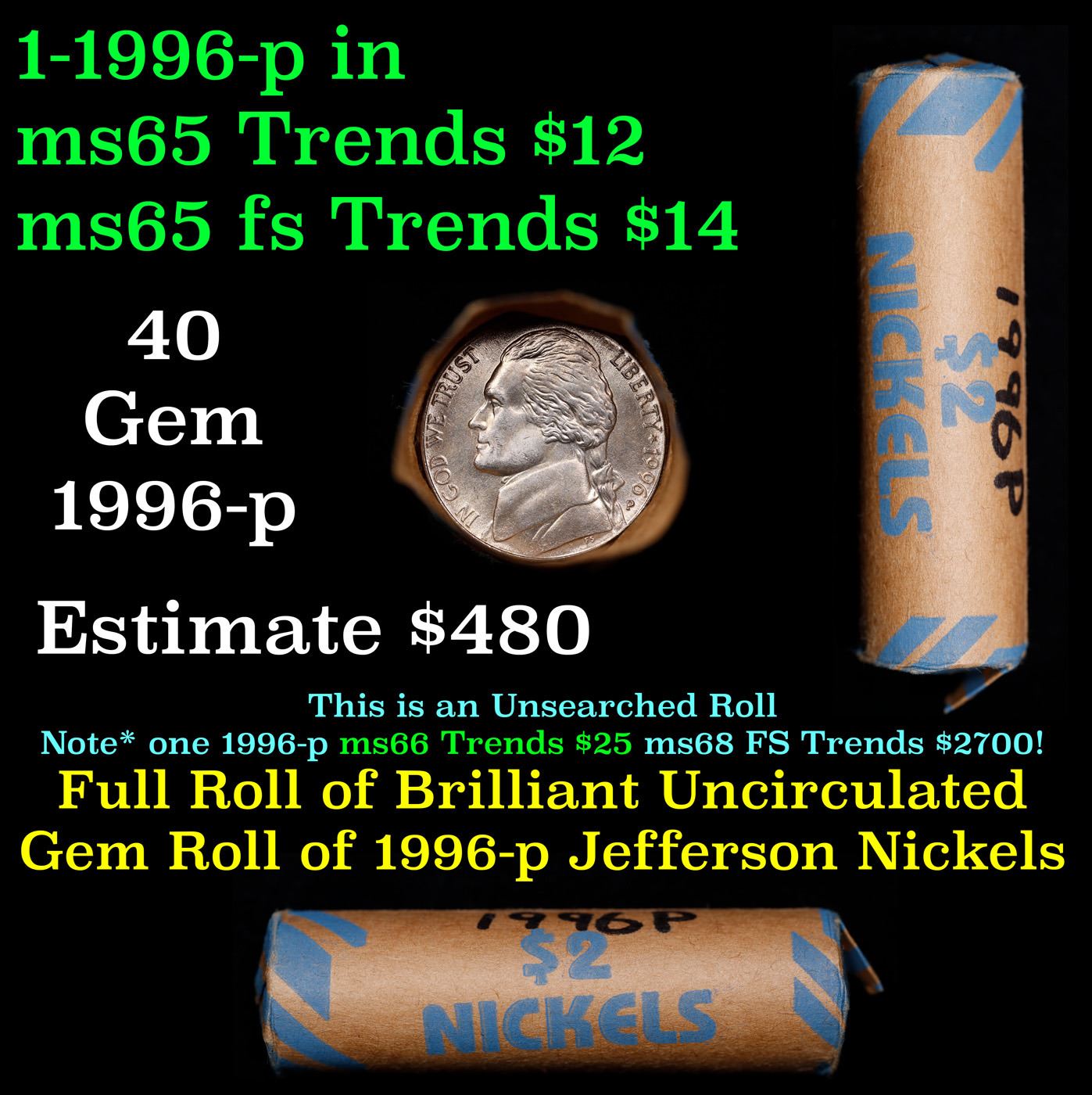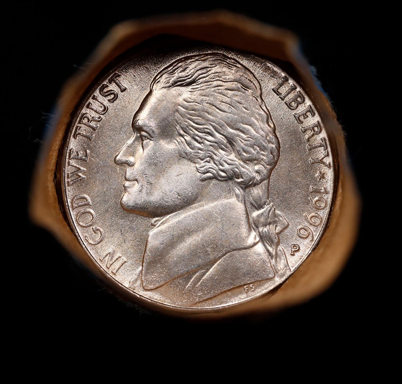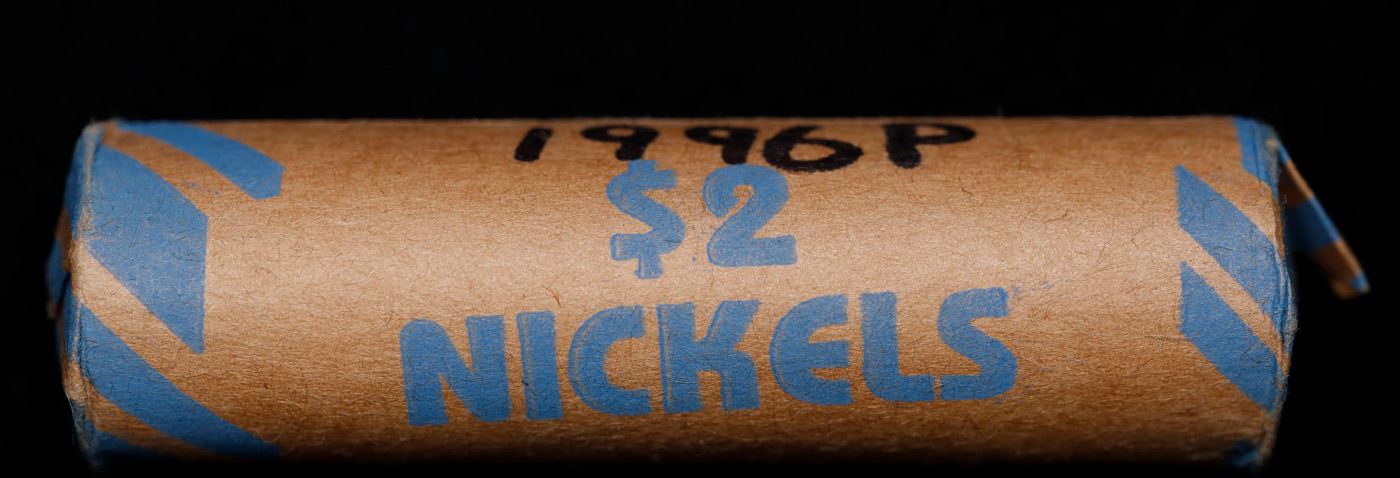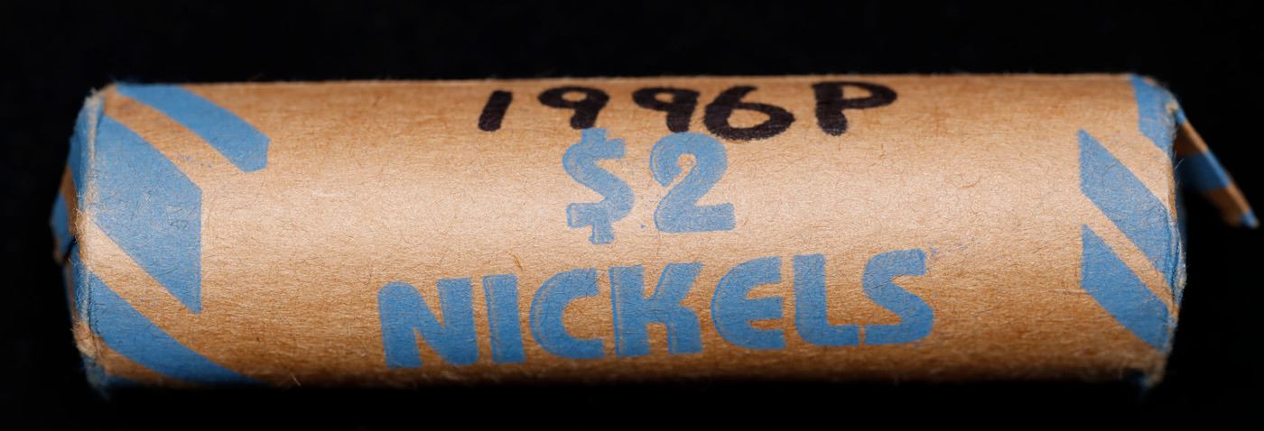 Shotgun Jefferson 5c roll, 1996-p 40 pcs Vintage Bank Wrapper. A terrific Shotgun roll of unsearched Jefferson nickles. Most if not all coins should be gem or better