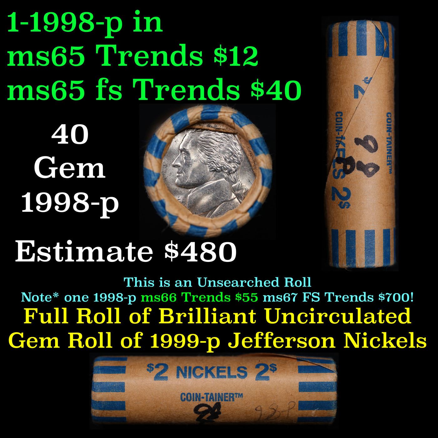 Shotgun Jefferson 5c roll, 1998-p 40 pcs Bank Wrapper. A terrific Shotgun roll of unsearched Jefferson nickles. Most if not all coins should be gem or better