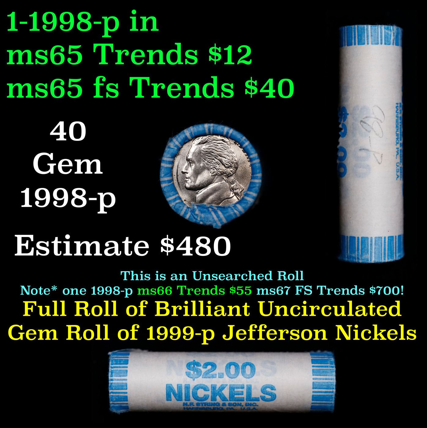 Shotgun Jefferson 5c roll, 1998-p 40 pcs String & Son Wrapper. A terrific Shotgun roll of unsearched Jefferson nickles. Most if not all coins should be gem or better
