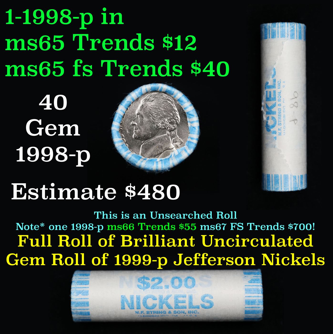 Shotgun Jefferson 5c roll, 1998-p 40 pcs String & Son Wrapper. A terrific Shotgun roll of unsearched Jefferson nickles. Most if not all coins should be gem or better