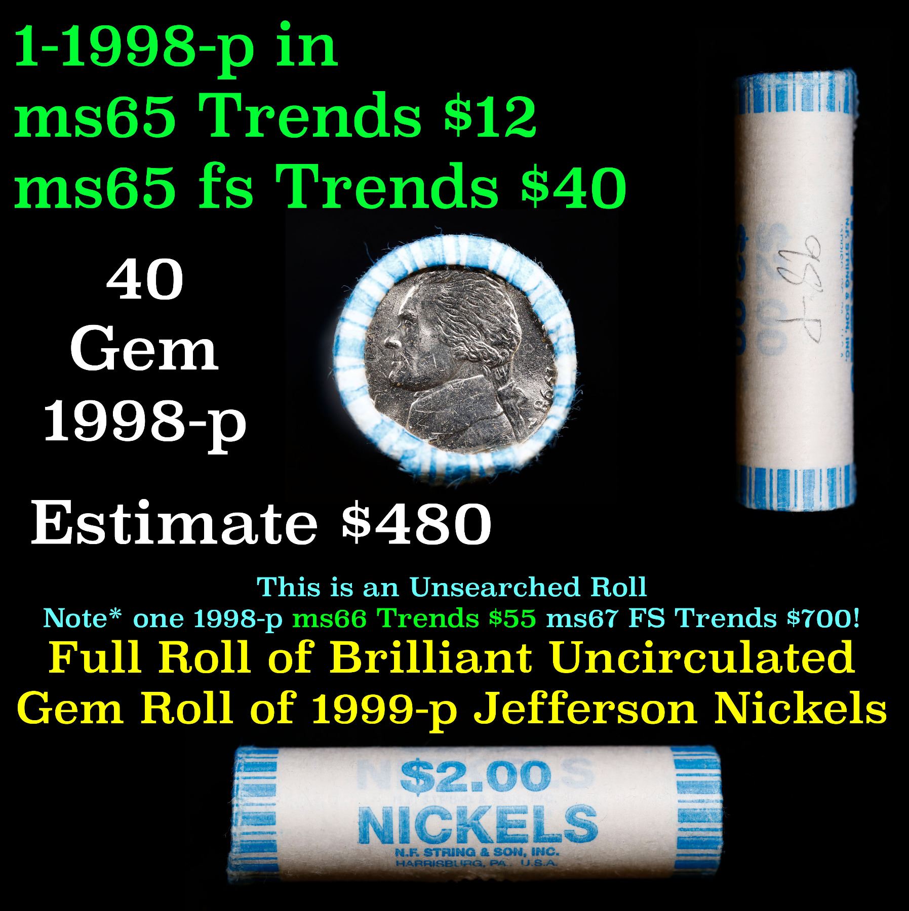 Shotgun Jefferson 5c roll, 1998-p 40 pcs String & Son Wrapper. A terrific Shotgun roll of unsearched Jefferson nickles. Most if not all coins should be gem or better