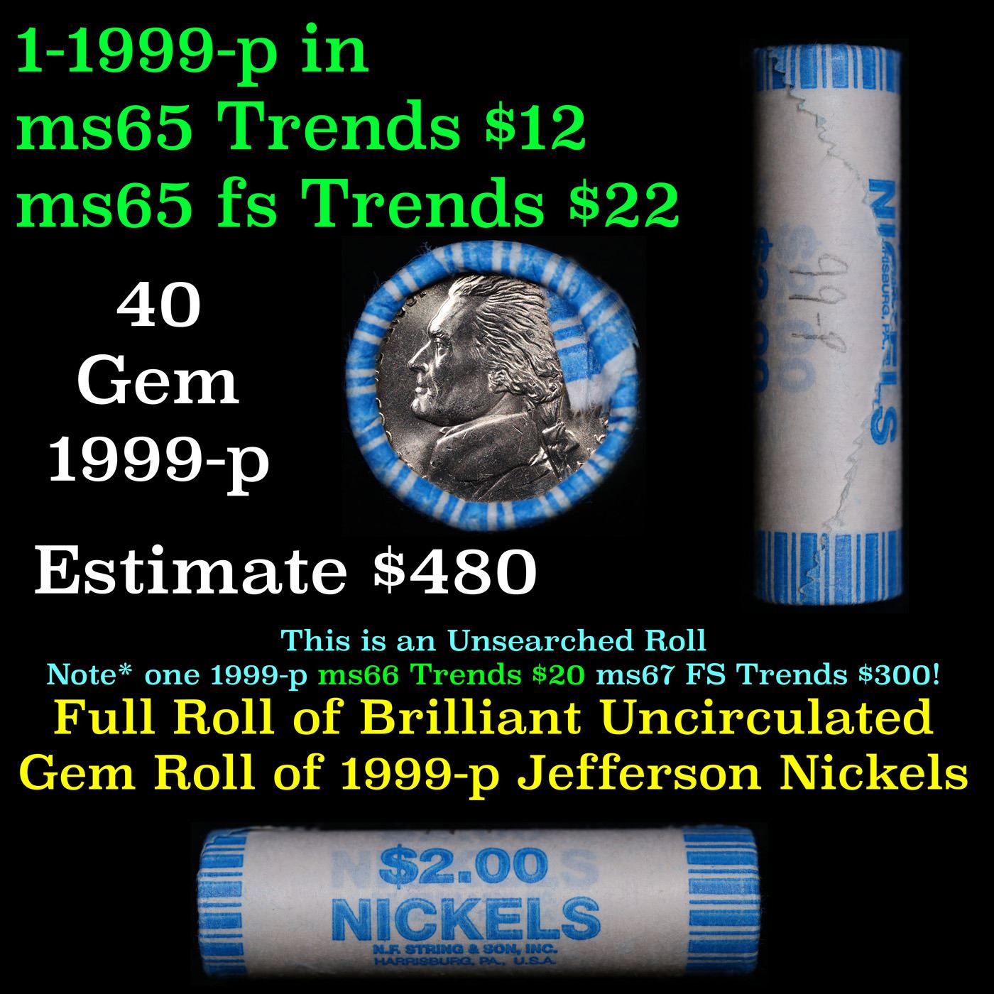 Shotgun Jefferson 5c roll, 1999-p 40 pcs Bank Wrapper. A terrific Shotgun roll of unsearched Jefferson nickles. Most if not all coins should be gem or better