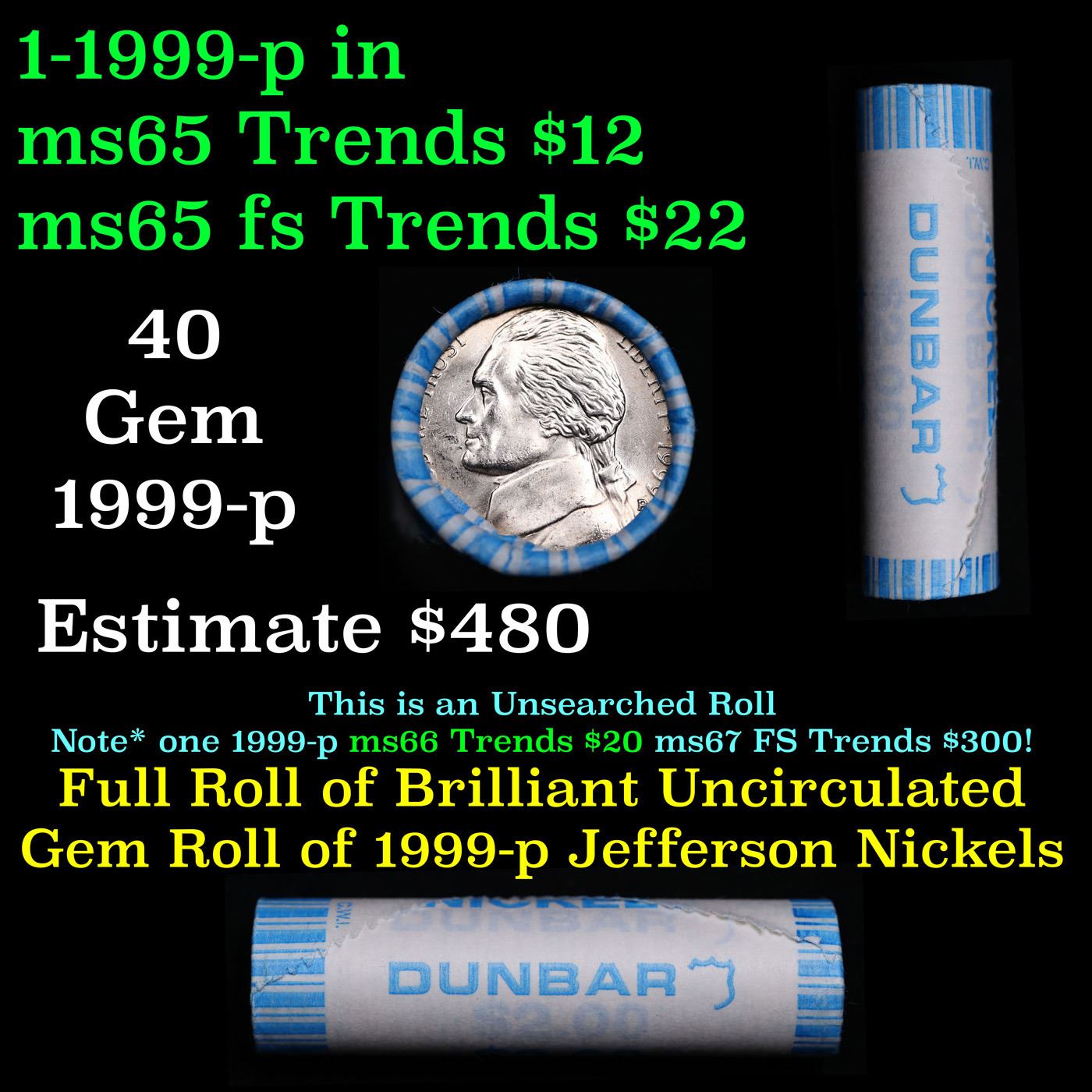 Shotgun Jefferson 5c roll, 1999-p 40 pcs Dunbar Wrapper. A terrific Shotgun roll of unsearched Jefferson nickles. Most if not all coins should be gem or better