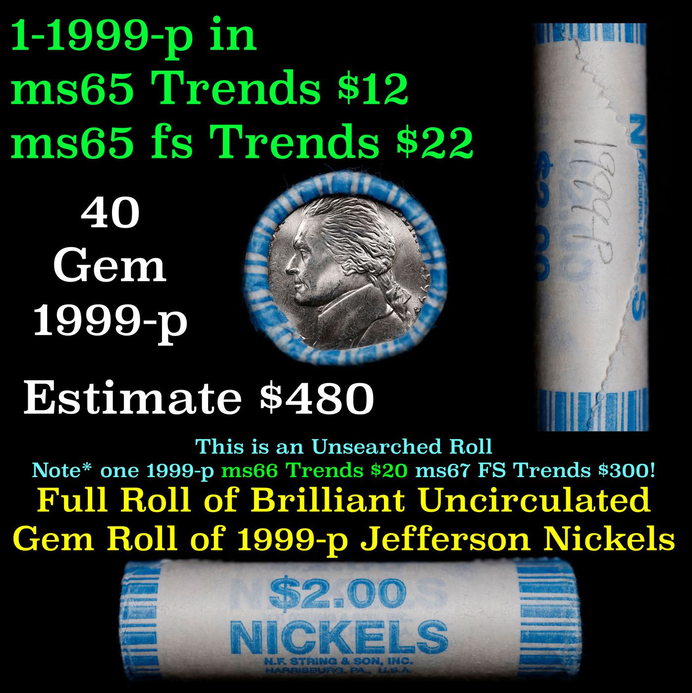 Shotgun Jefferson 5c roll, 1999-p 40 pcs String & Son Wrapper. A terrific Shotgun roll of unsearched Jefferson nickles. Most if not all coins should be gem or better