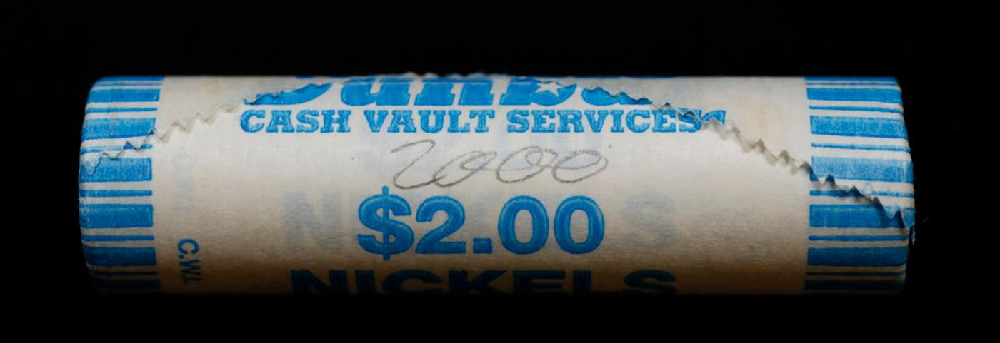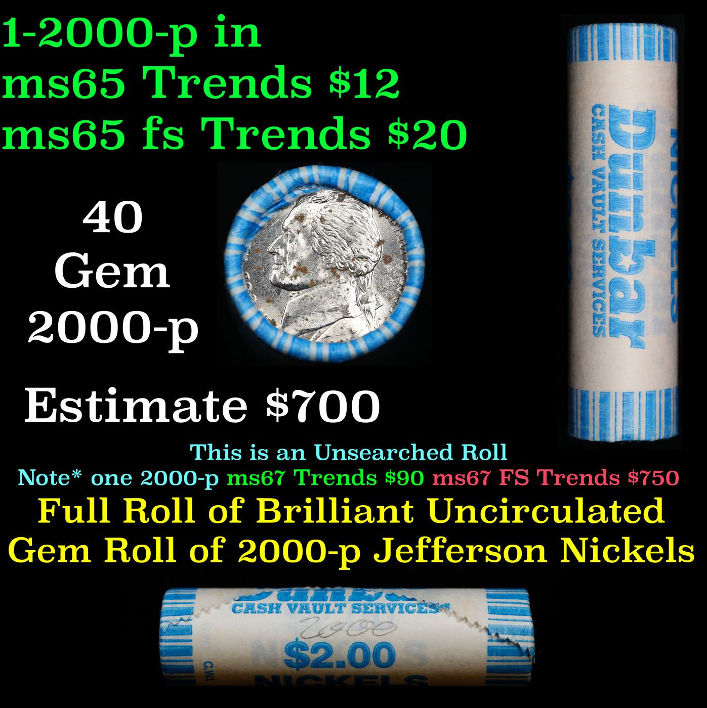 Shotgun Jefferson 5c roll, 2000-p 40 pcs DUnbar Wrapper. A terrific Shotgun roll of unsearched Jefferson nickles. Most if not all coins should be gem or better