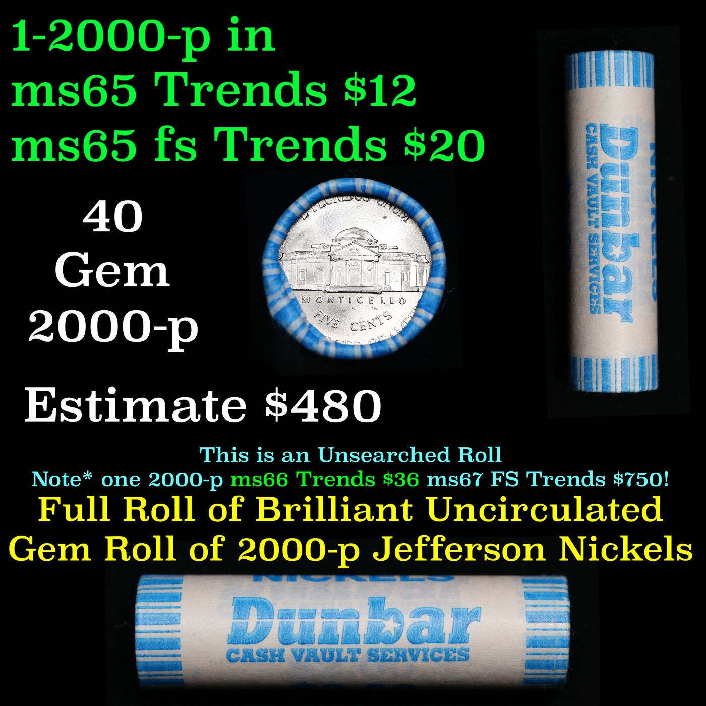 Shotgun Jefferson 5c roll, 2000-p 40 pcs Dunbar Wrapper. A terrific Shotgun roll of unsearched Jefferson nickles. Most if not all coins should be gem or better
