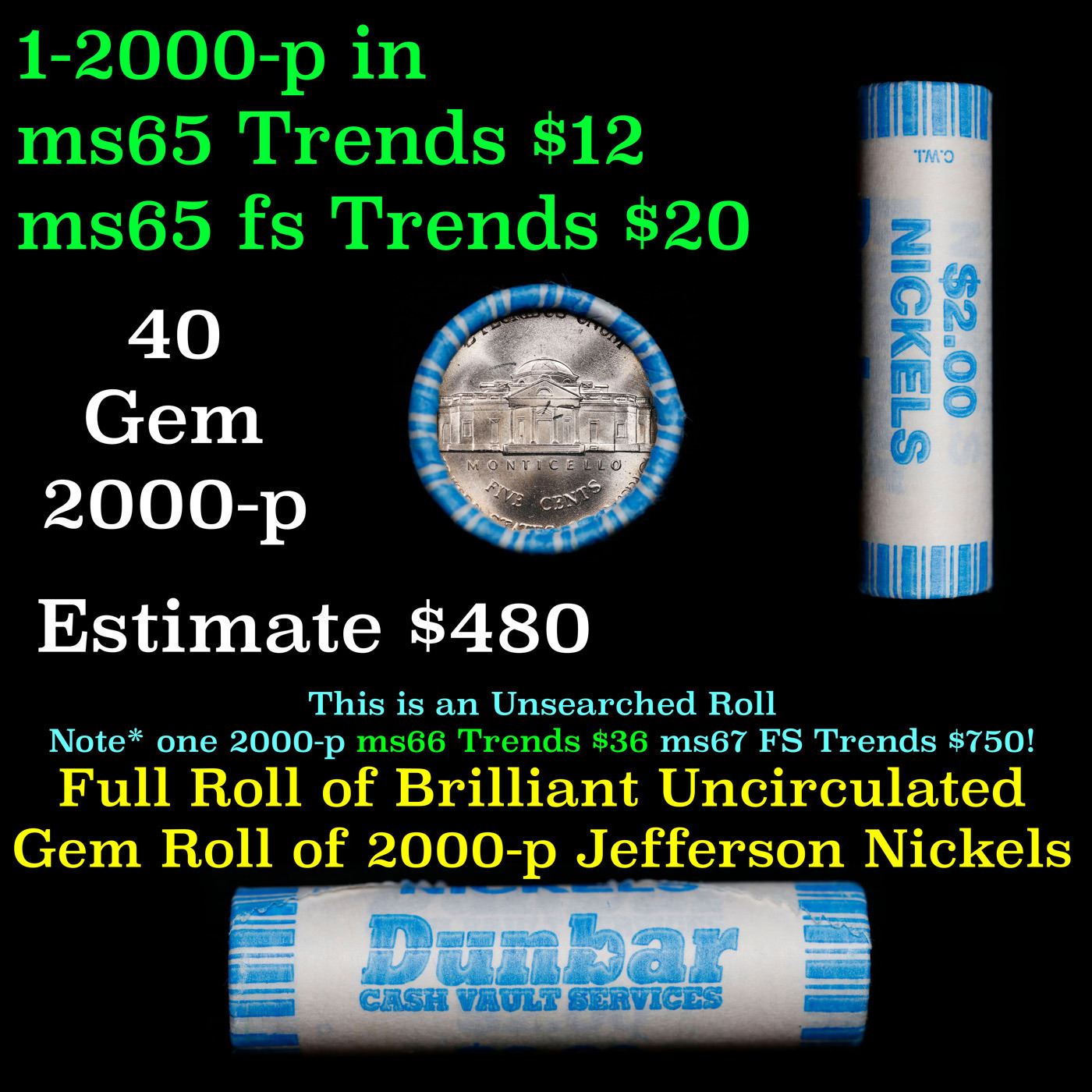 Shotgun Jefferson 5c roll, 2000-p 40 pcs Dunbar Wrapper. A terrific Shotgun roll of unsearched Jefferson nickles. Most if not all coins should be gem or better