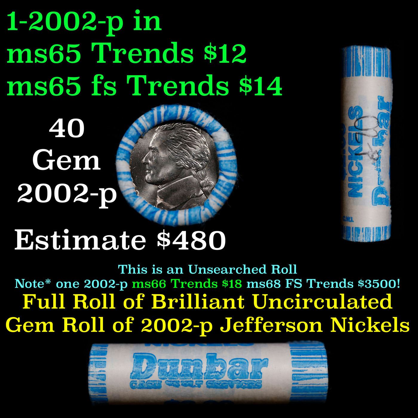 Shotgun Jefferson 5c roll, 2002-p 40 pcs Dunbar Wrapper. A terrific Shotgun roll of unsearched Jefferson nickles. Most if not all coins should be gem or better