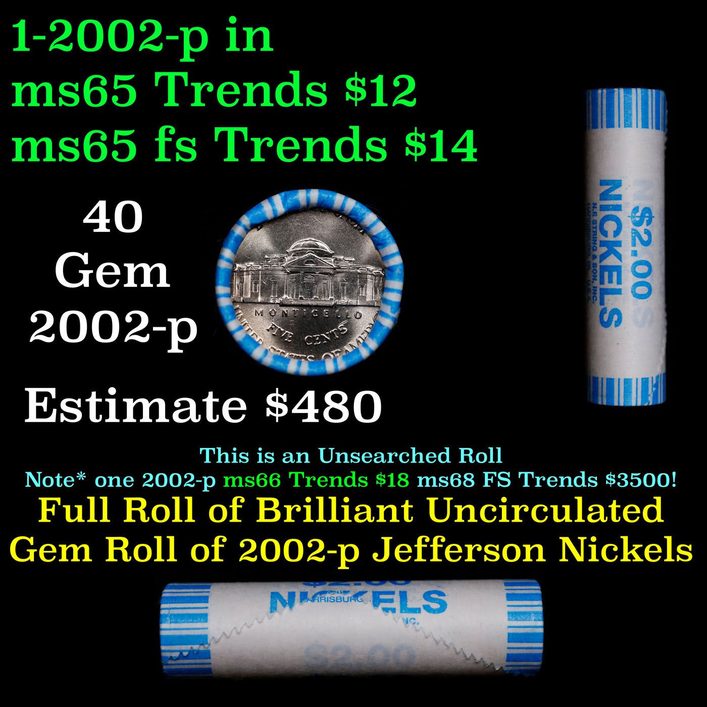 Shotgun Jefferson 5c roll, 2002-p 40 pcs String & Son Wrapper. A terrific Shotgun roll of unsearched Jefferson nickles. Most if not all coins should be gem or better