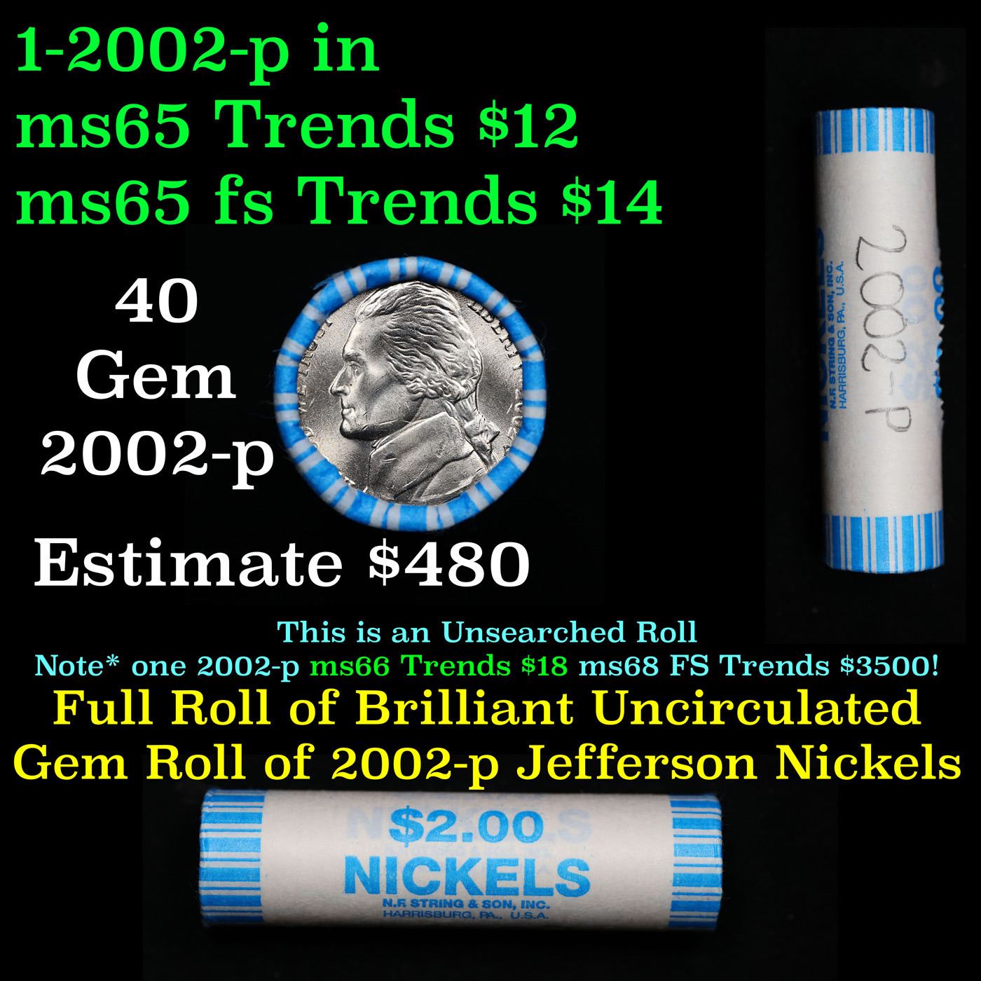 Shotgun Jefferson 5c roll, 2002-p 40 pcs String & Son Wrapper. A terrific Shotgun roll of unsearched Jefferson nickles. Most if not all coins should be gem or better