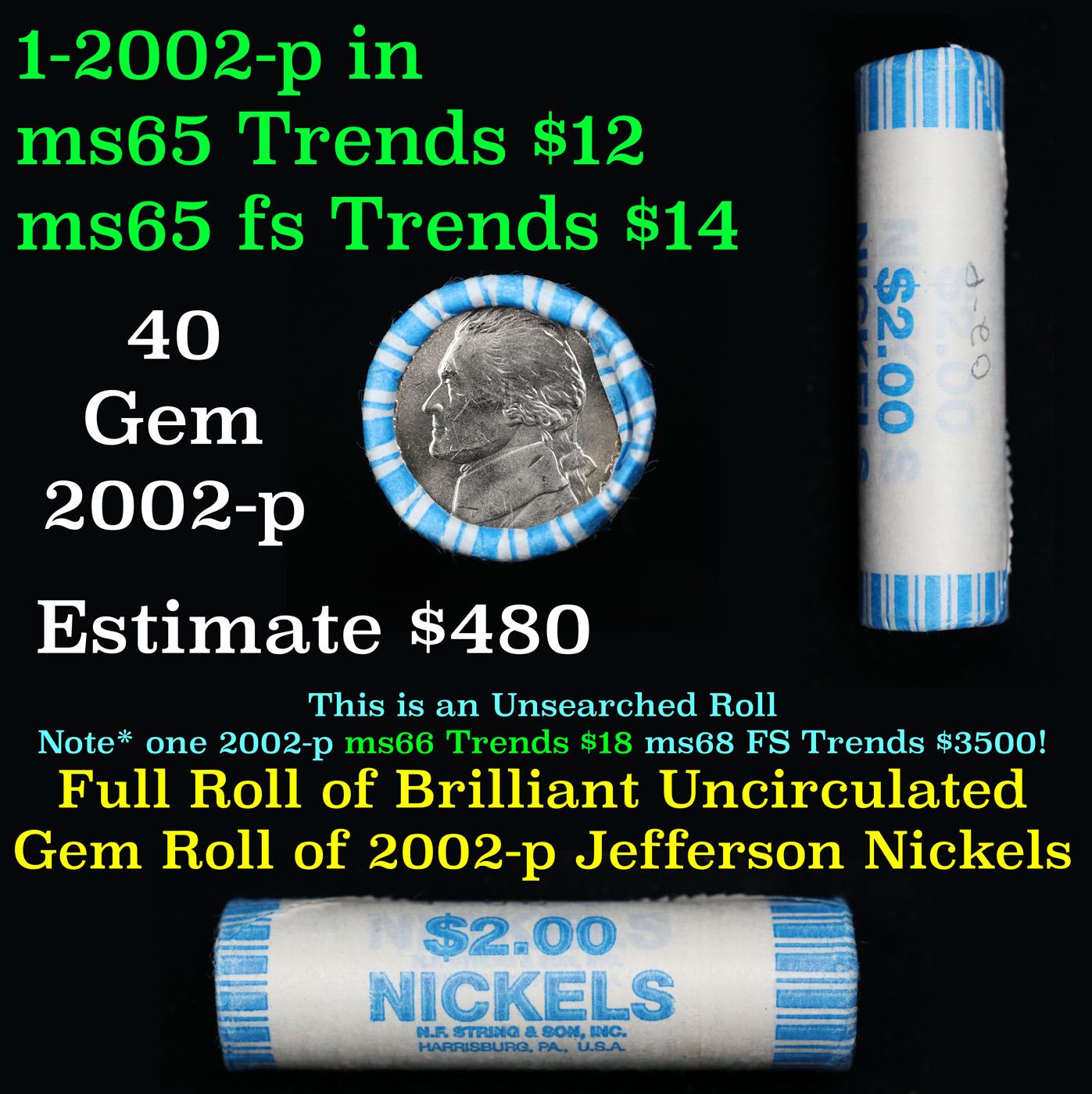 Shotgun Jefferson 5c roll, 2002-p 40 pcs String & Son Wrapper. A terrific Shotgun roll of unsearched Jefferson nickles. Most if not all coins should be gem or better