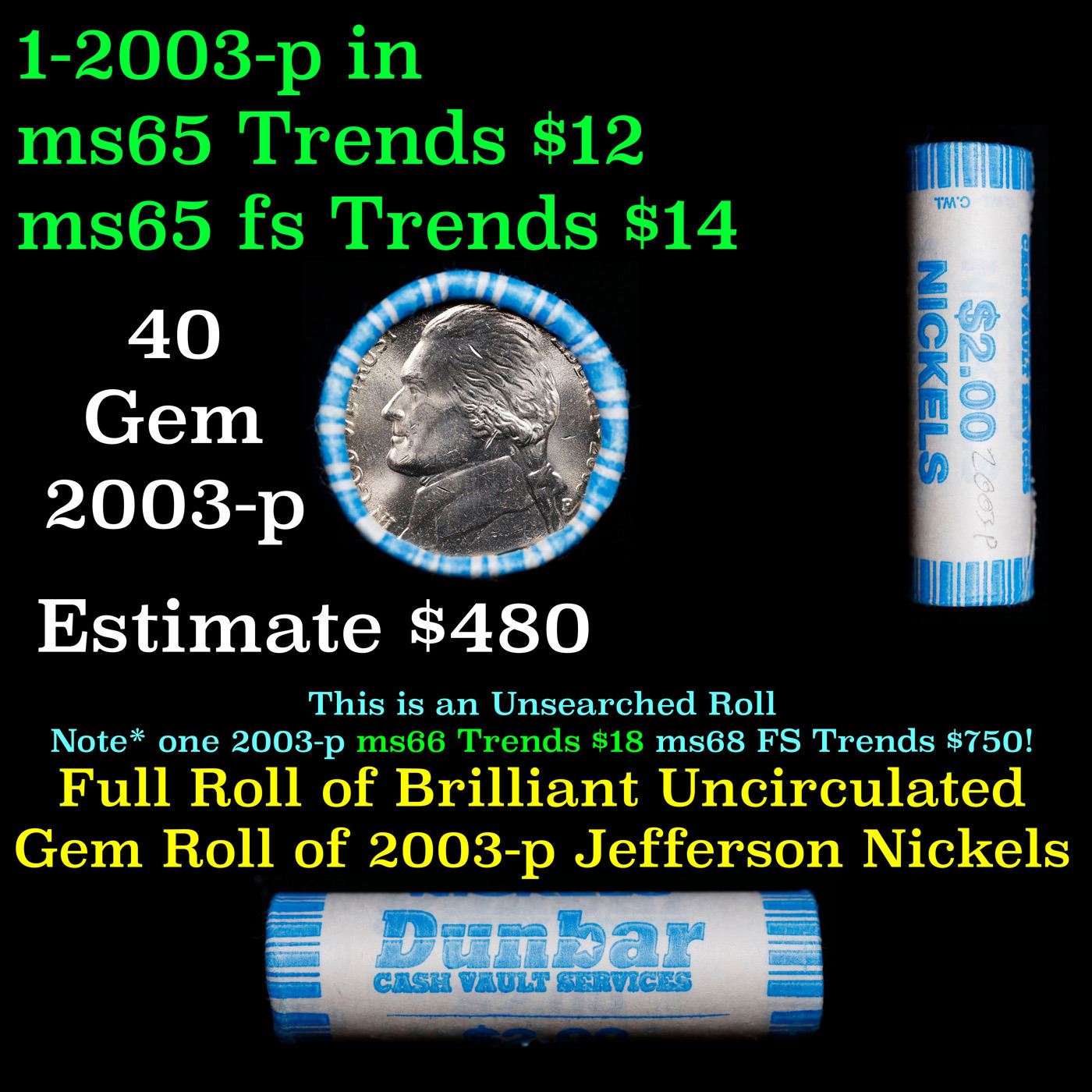 Shotgun Jefferson 5c roll, 2003-p 40 pcs Dunbar Wrapper. A terrific Shotgun roll of unsearched Jefferson nickles. Most if not all coins should be gem or better