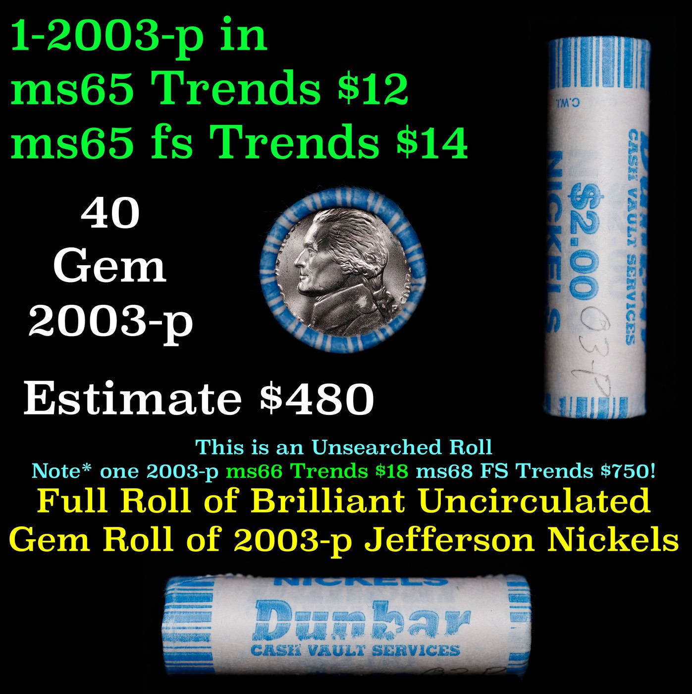 Shotgun Jefferson 5c roll, 2003-p 40 pcs Dunbar Wrapper. A terrific Shotgun roll of unsearched Jefferson nickles. Most if not all coins should be gem or better