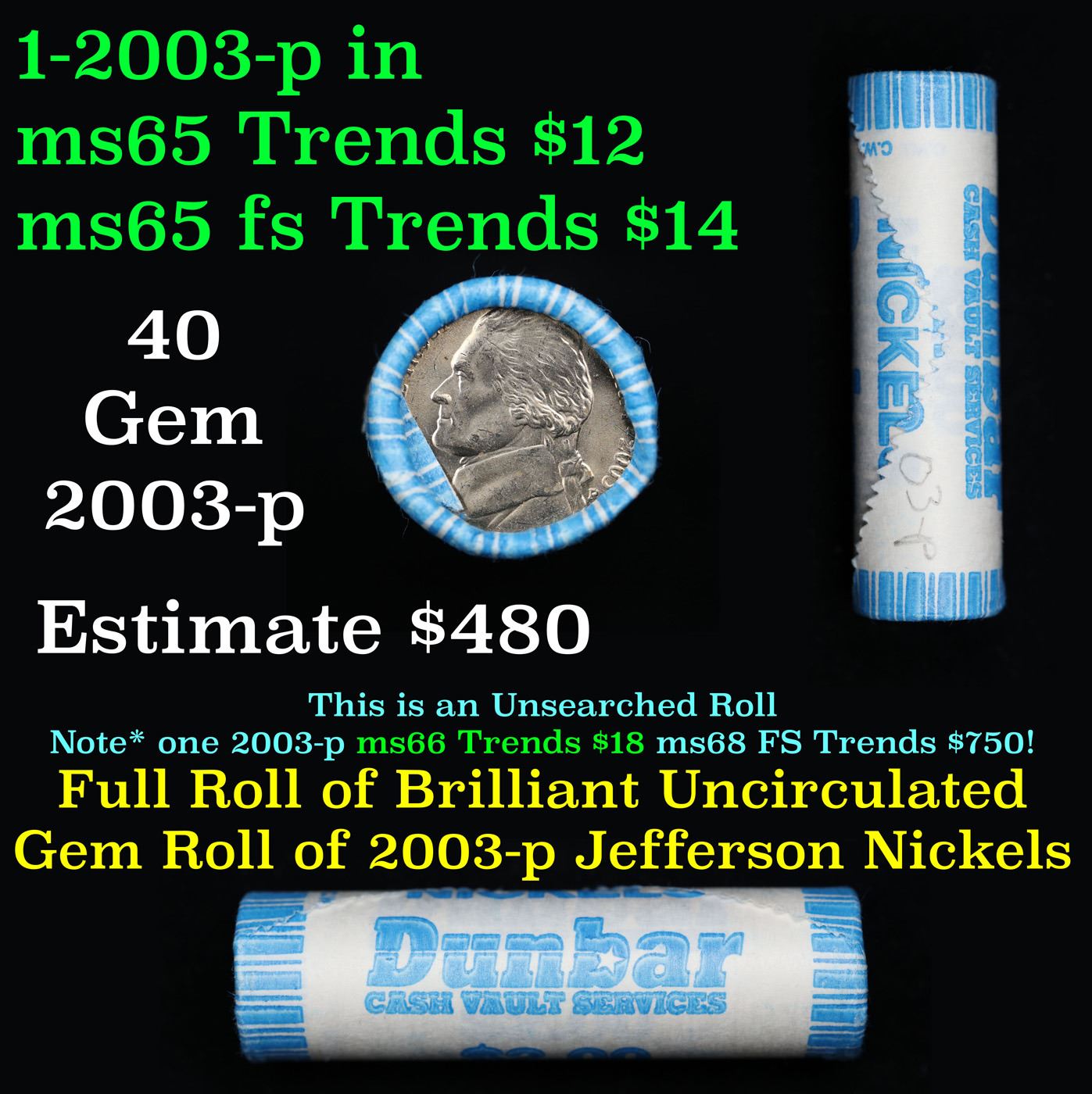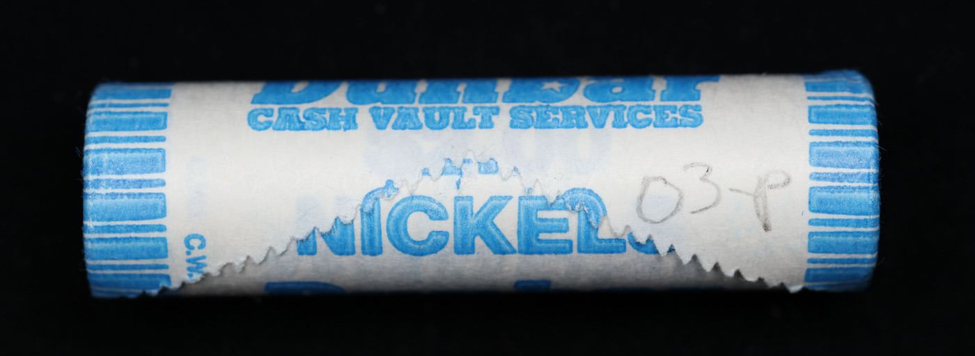 Shotgun Jefferson 5c roll, 2003-p 40 pcs Dunbar Wrapper. A terrific Shotgun roll of unsearched Jefferson nickles. Most if not all coins should be gem or better