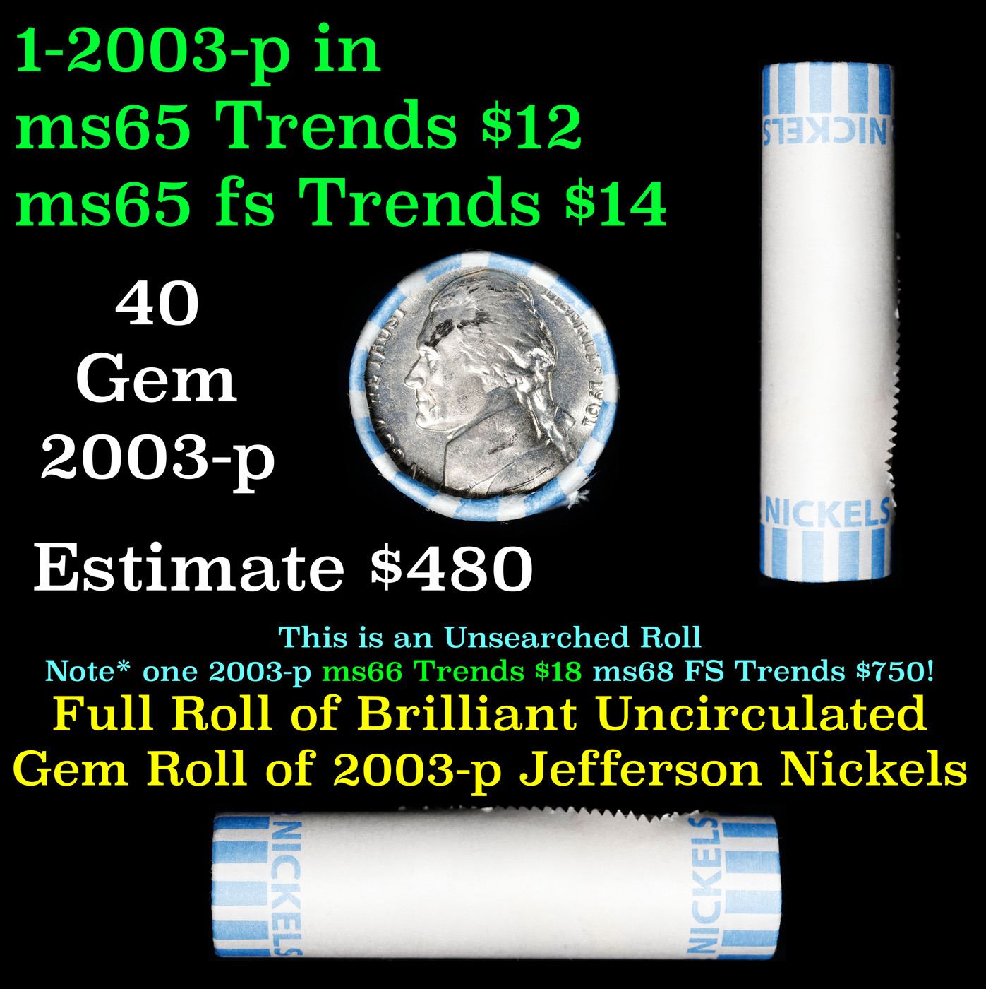 Shotgun Jefferson 5c roll, 2003-p 40 pcs Dunbar Wrapper. A terrific Shotgun roll of unsearched Jefferson nickles. Most if not all coins should be gem or better