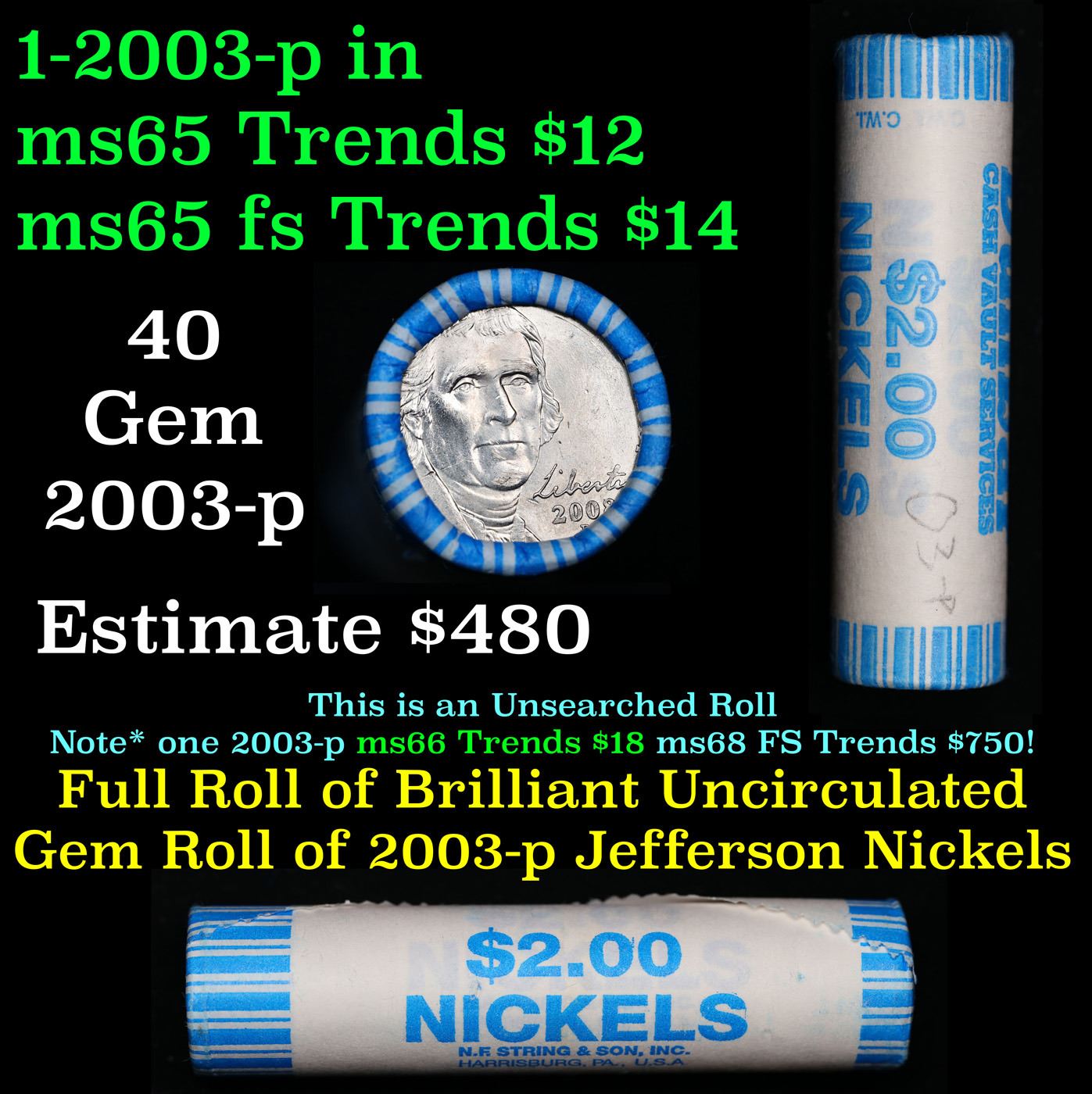 Shotgun Jefferson 5c roll, 2003-p 40 pcs Dunbar Wrapper. A terrific Shotgun roll of unsearched Jefferson nickles. Most if not all coins should be gem or better
