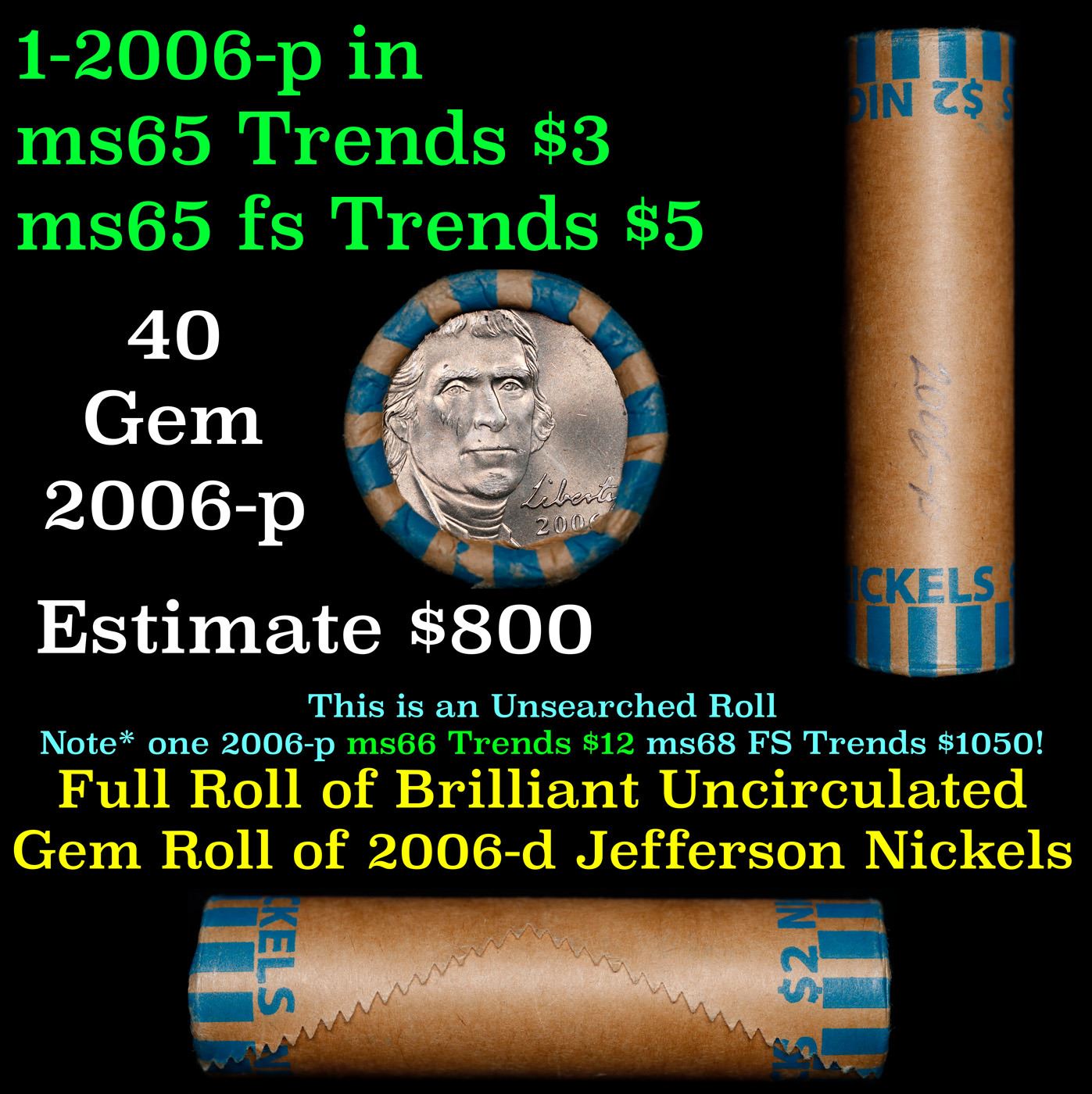 Shotgun Jefferson 5c roll,2006-p 40 pcs Bank Wrapper. A terrific Shotgun roll of unsearched Jefferson nickles. Most if not all coins should be gem or better