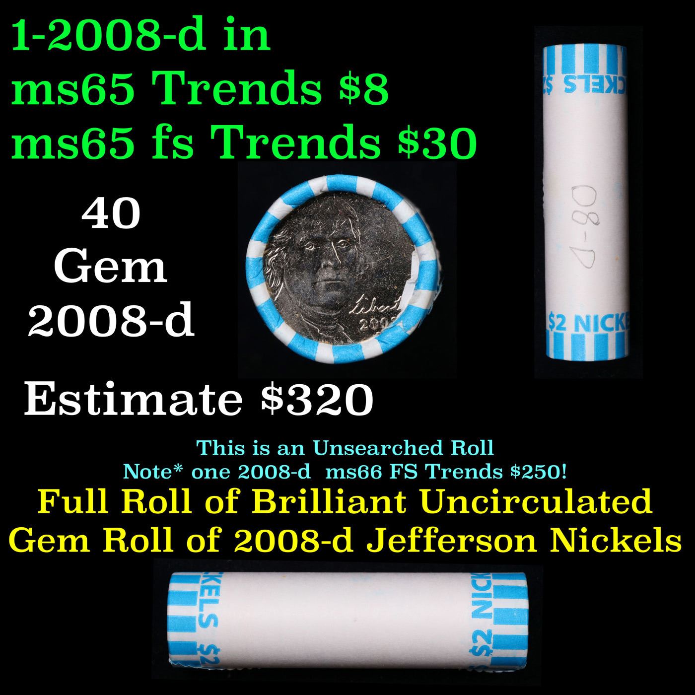 Shotgun Jefferson 5c roll, 2008-d 40 pcs Bank Wrapper. A terrific Shotgun roll of unsearched Jefferson nickles. Most if not all coins should be gem or better