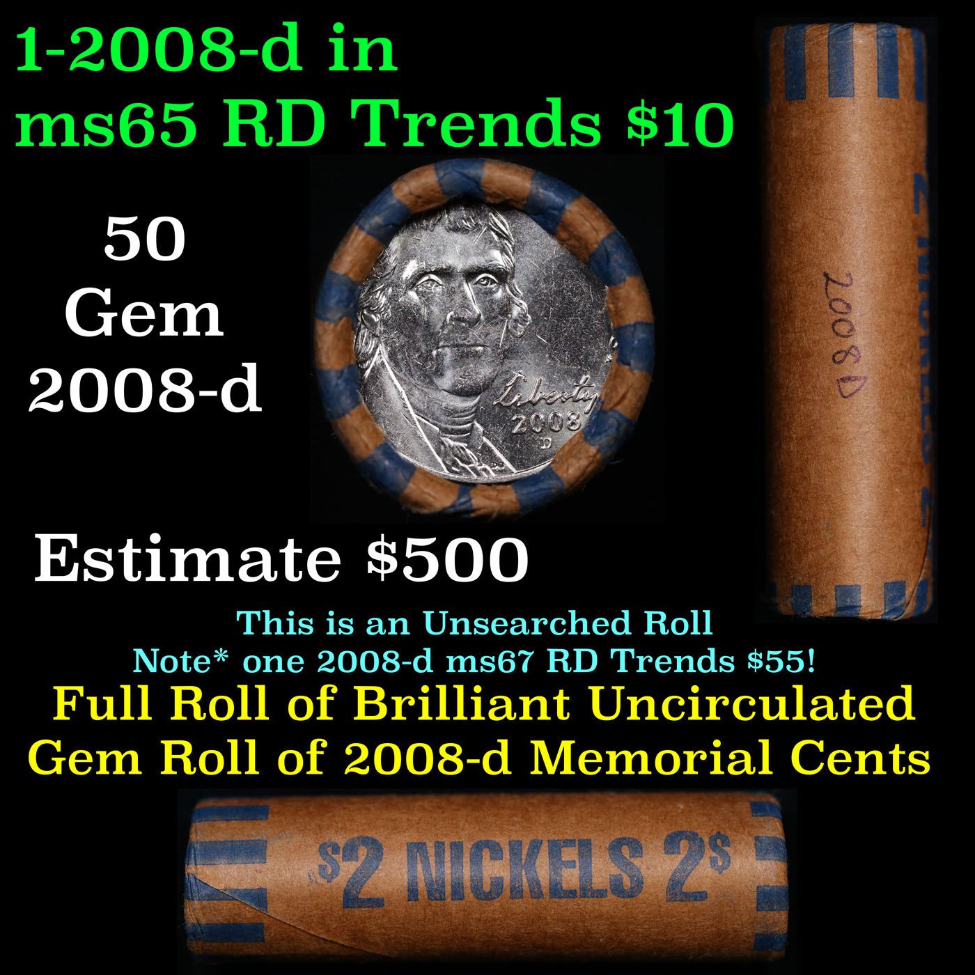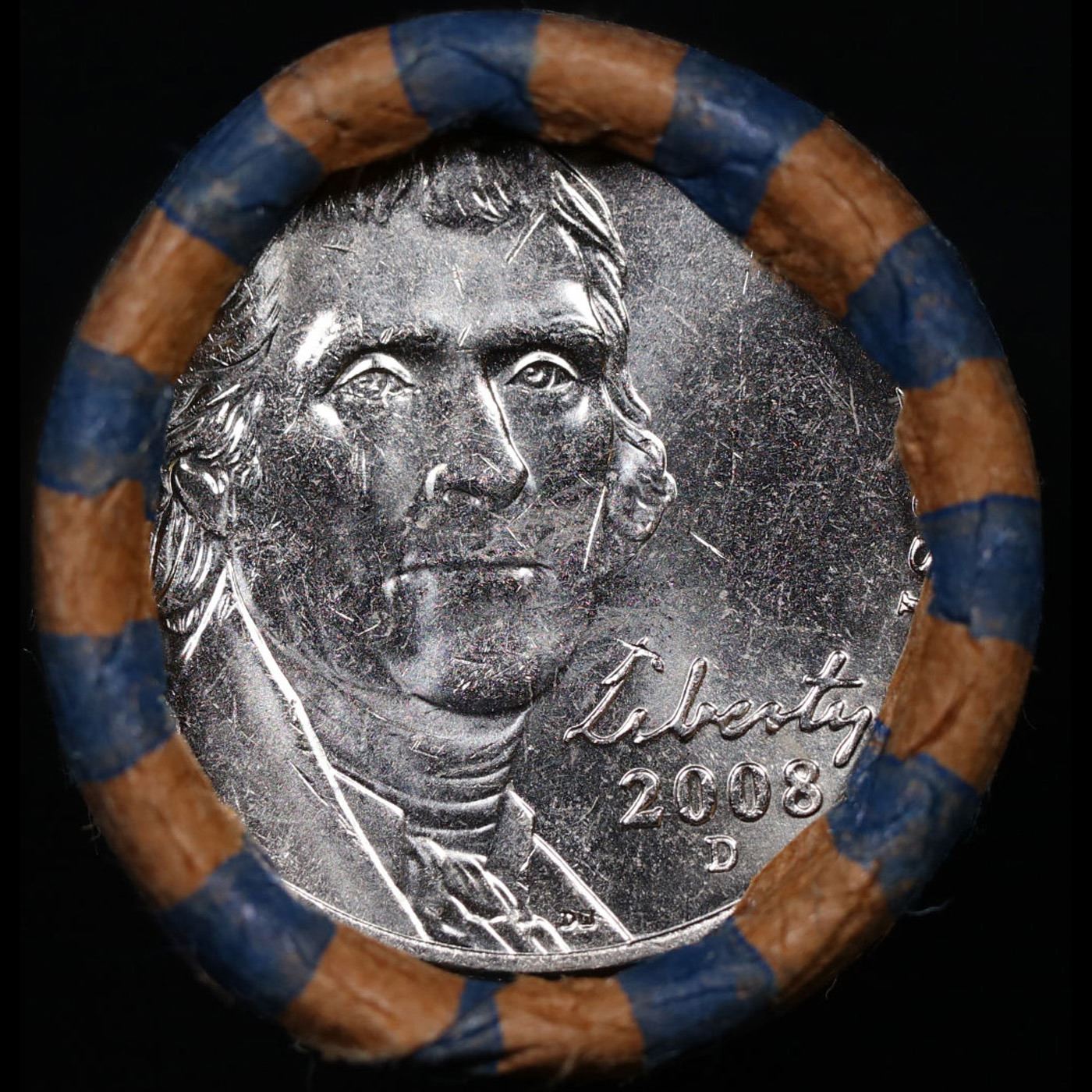 Shotgun Jefferson 5c roll, 2008-d 40 pcs Bank Wrapper. A terrific Shotgun roll of unsearched Jefferson nickles. Most if not all coins should be gem or better