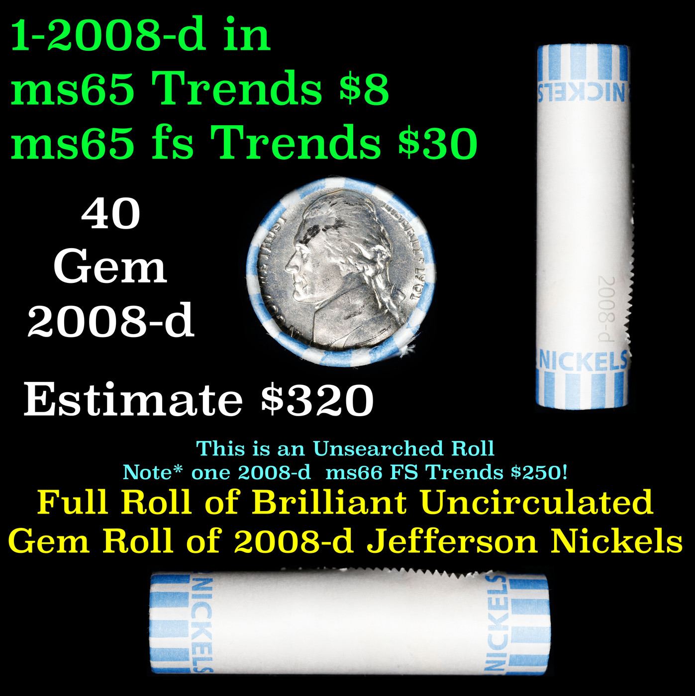 Shotgun Jefferson 5c roll, 2008-d 40 pcs Vintage Bank Wrapper. A terrific Shotgun roll of unsearched Jefferson nickles. Most if not all coins should be gem or better