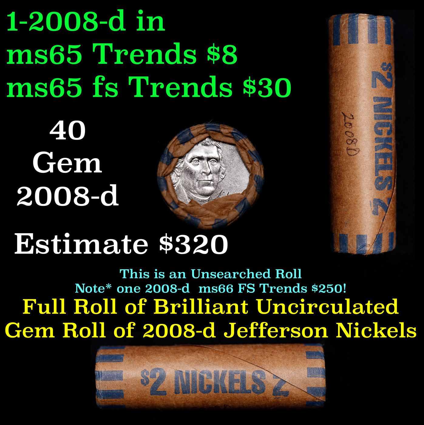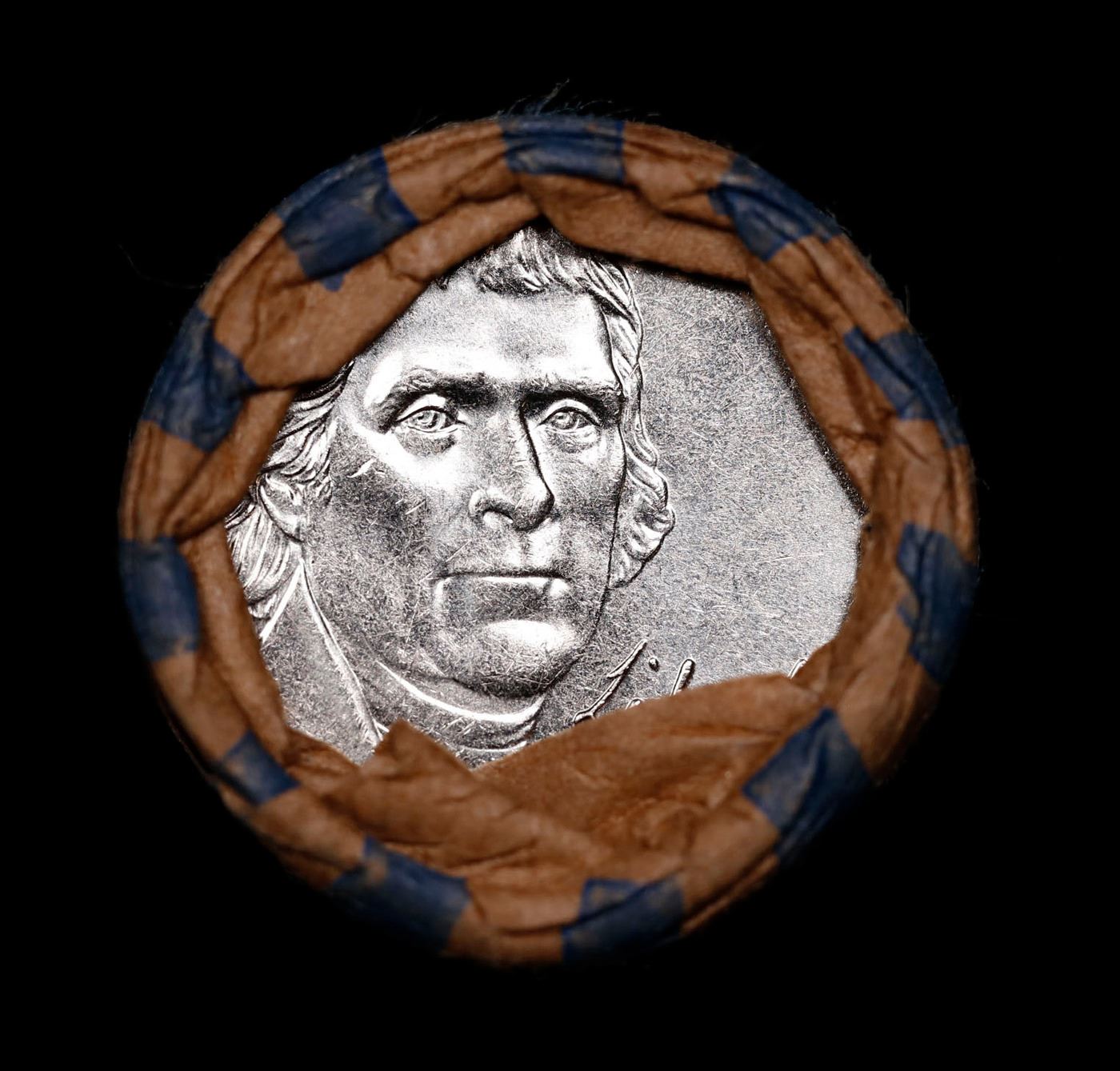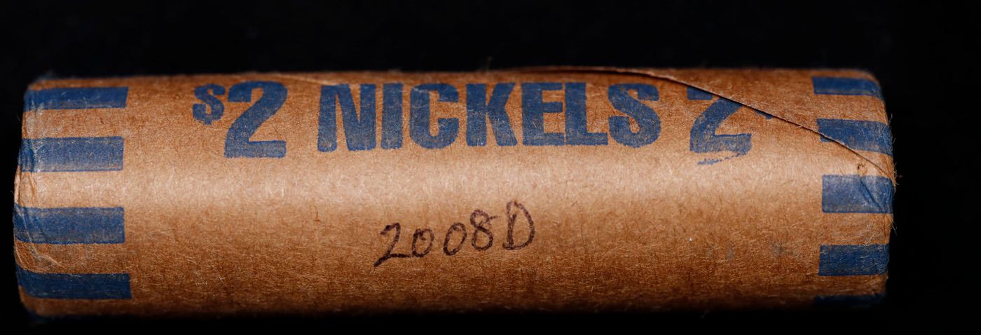 Shotgun Jefferson 5c roll, 2008-d 40 pcs Vintage Bank Wrapper. A terrific Shotgun roll of unsearched Jefferson nickles. Most if not all coins should be gem or better