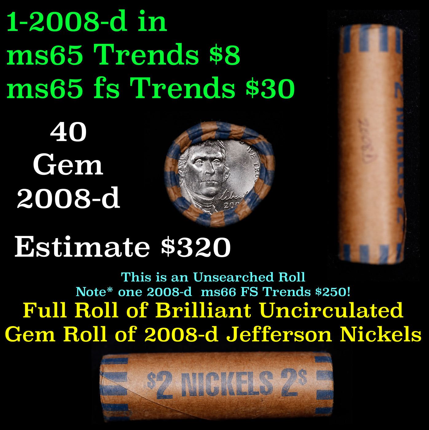 Shotgun Jefferson 5c roll, 2008-d 40 pcs Vintage Wrapper. A terrific Shotgun roll of unsearched Jefferson nickles. Most if not all coins should be gem or better