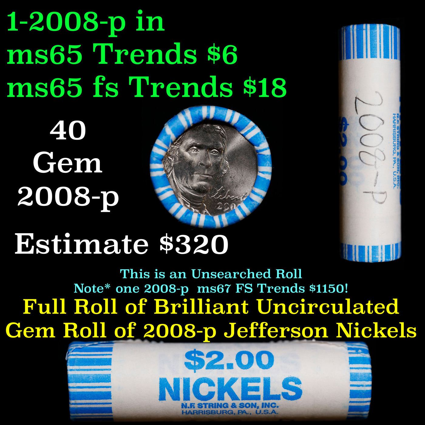 Shotgun Jefferson 5c roll, 2008-p 40 pcs String & Son Wrapper. A terrific Shotgun roll of unsearched Jefferson nickles. Most if not all coins should be gem or better