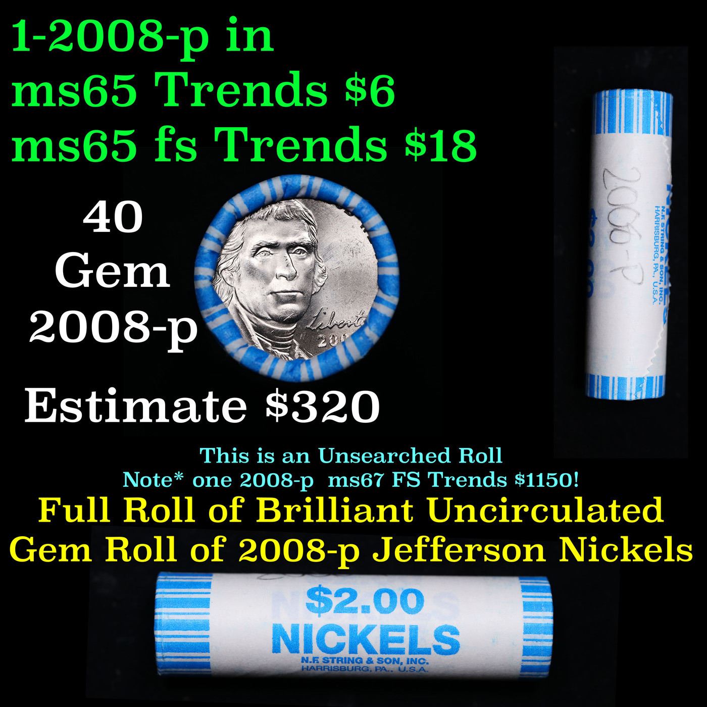Shotgun Jefferson 5c roll, 2008-p 40 pcs String & Son Wrapper. A terrific Shotgun roll of unsearched Jefferson nickles. Most if not all coins should be gem or better