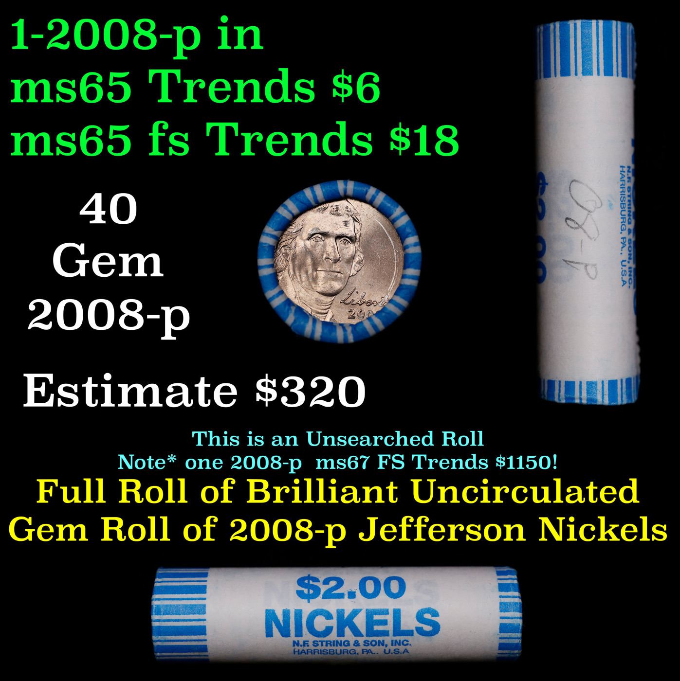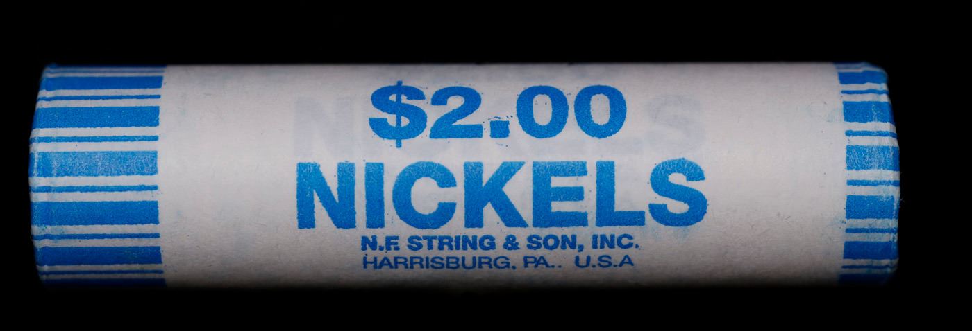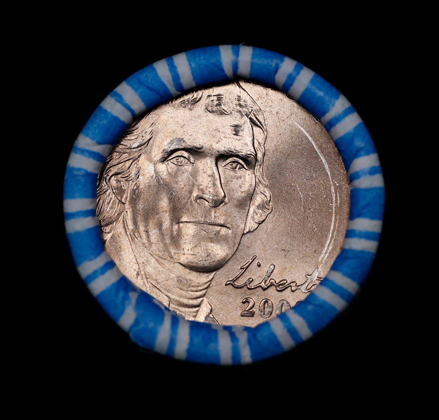 Shotgun Jefferson 5c roll, 2008-p 40 pcs String & Son Wrapper. A terrific Shotgun roll of unsearched Jefferson nickles. Most if not all coins should be gem or better