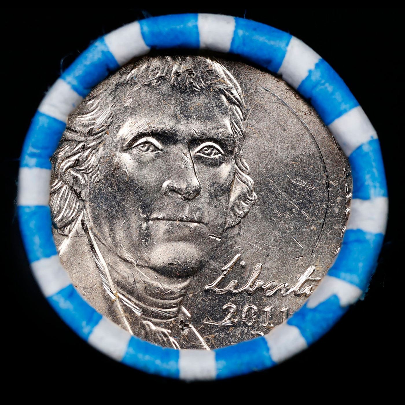 Shotgun Jefferson 5c roll, 2011-d 40 pcs Loomis Wrapper. A terrific Shotgun roll of unsearched Jefferson nickles. Most if not all coins should be gem or better