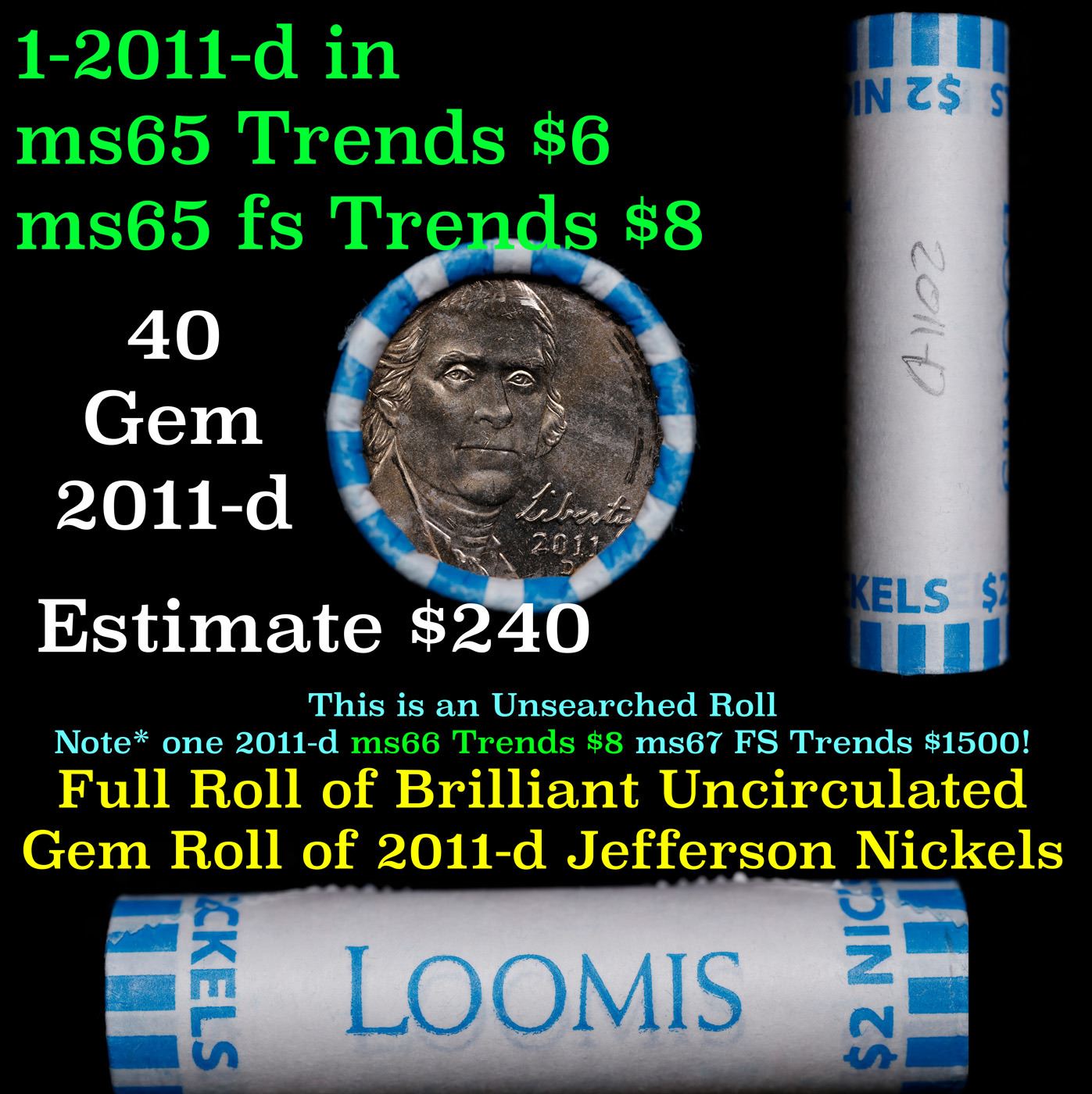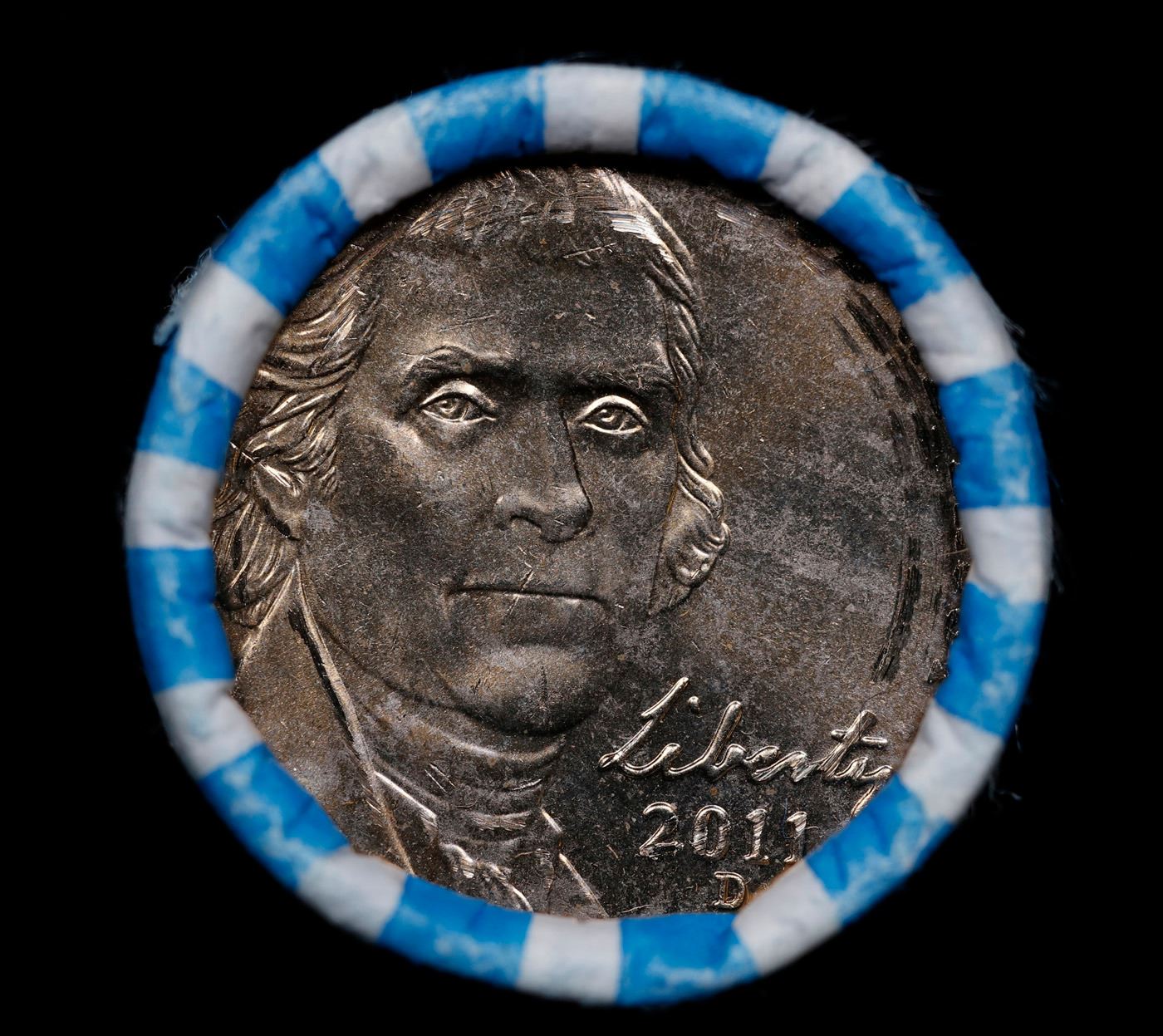 Shotgun Jefferson 5c roll, 2011-d 40 pcs Loomis Wrapper. A terrific Shotgun roll of unsearched Jefferson nickles. Most if not all coins should be gem or better