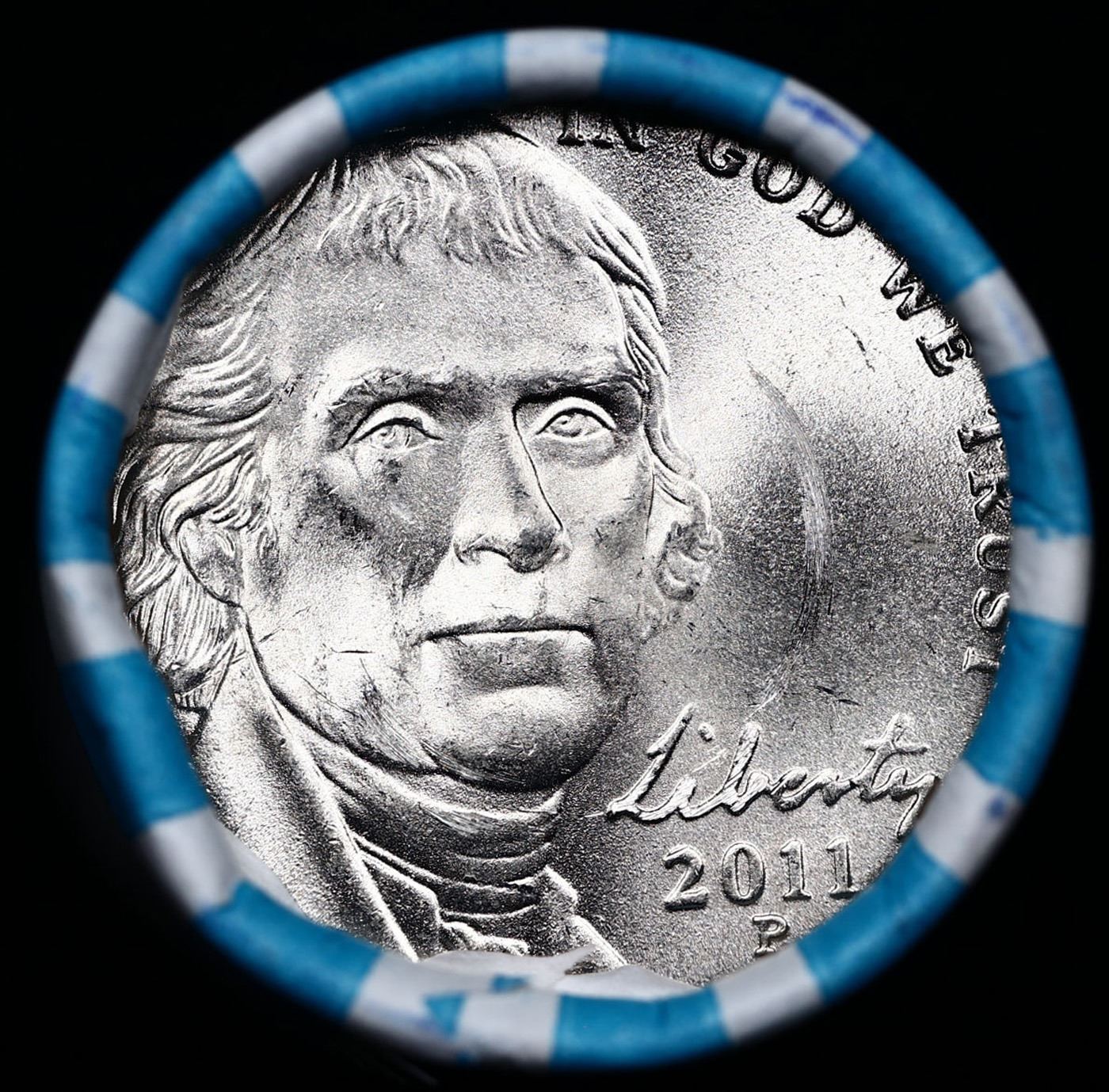 Shotgun Jefferson 5c roll, 2011-p 40 pcs Bank Wrapper. A terrific Shotgun roll of unsearched Jefferson nickles. Most if not all coins should be gem or better