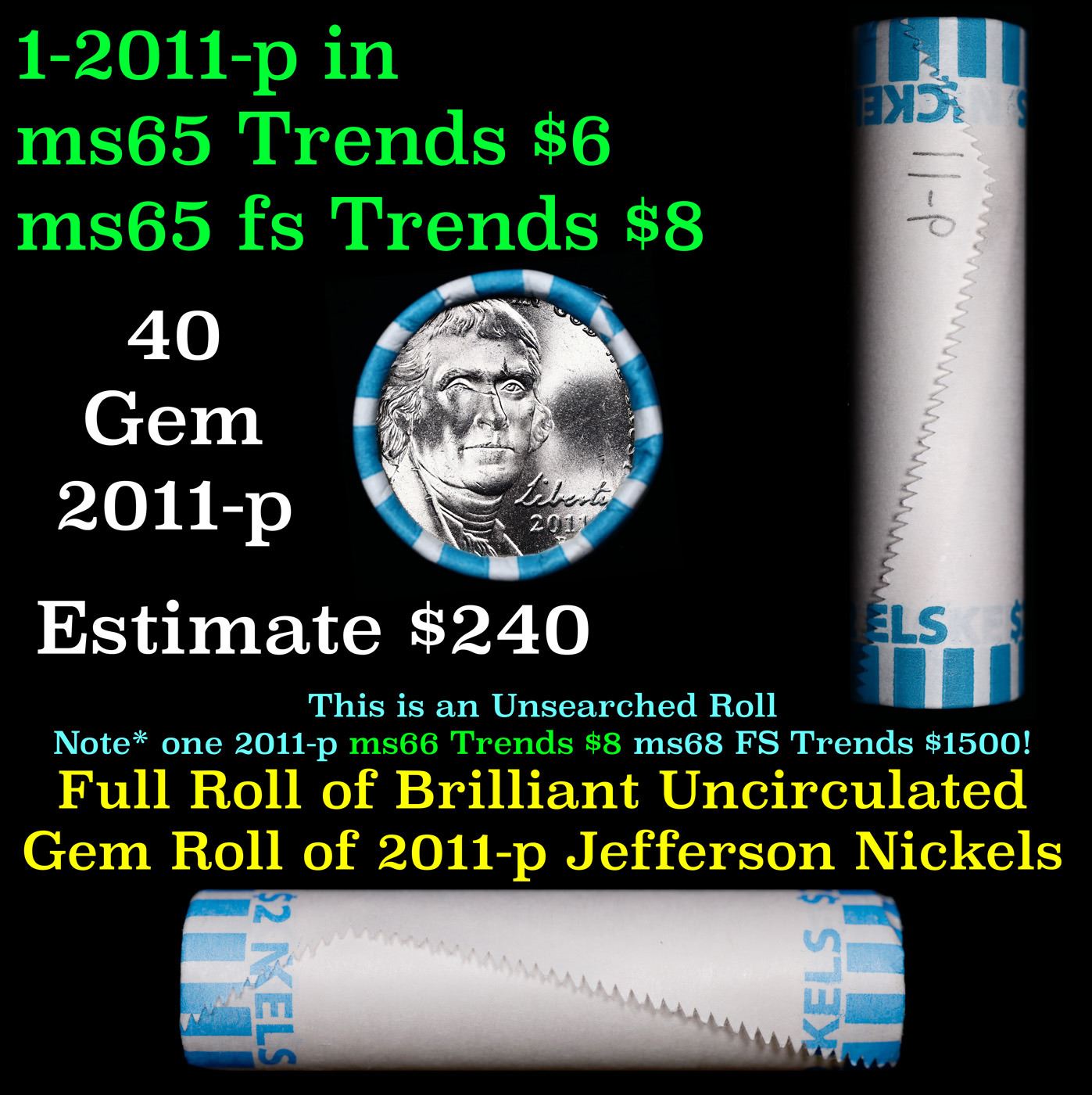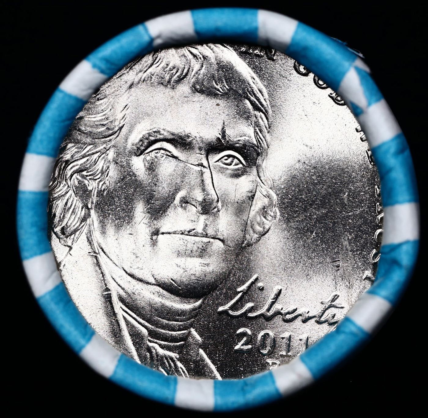 Shotgun Jefferson 5c roll, 2011-p 40 pcs Bank Wrapper. A terrific Shotgun roll of unsearched Jefferson nickles. Most if not all coins should be gem or better
