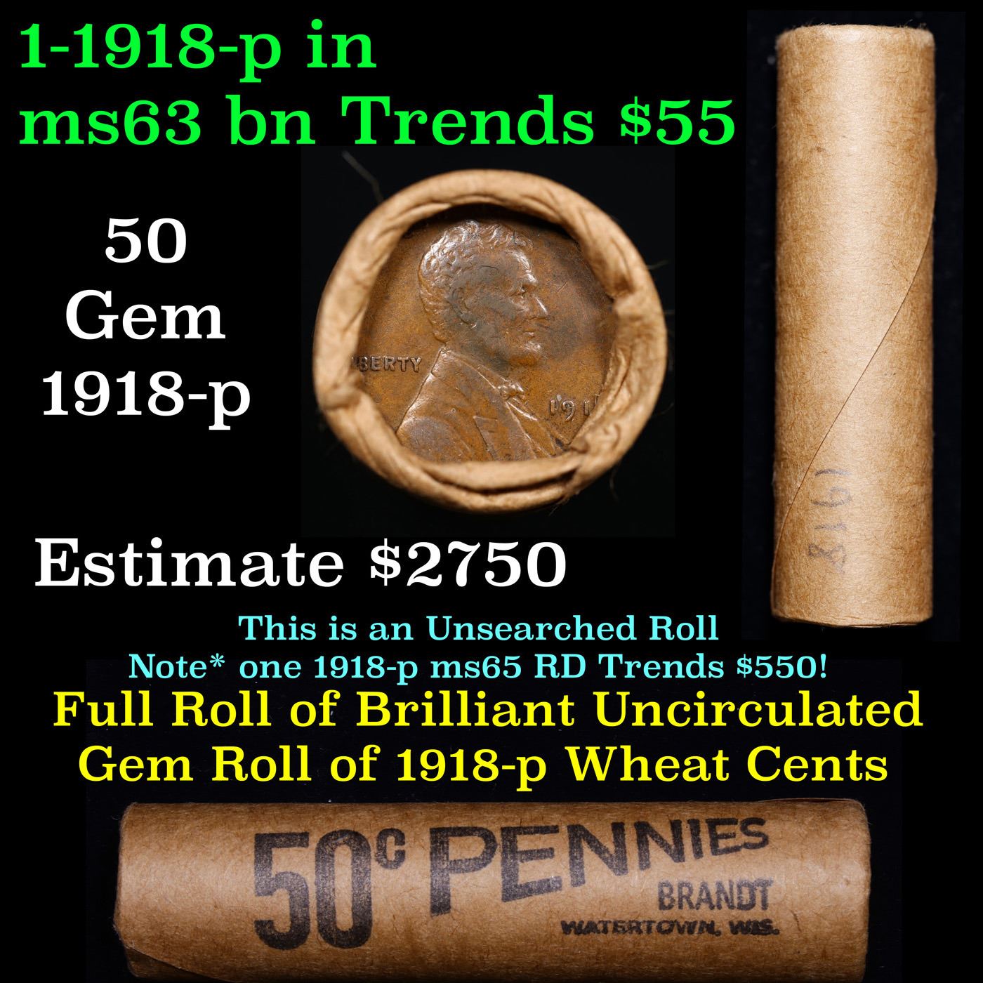 Shotgun Lincoln 1c roll, 1918-p 50 pcs Brandt Wrapper.. A terrific Shotgun roll of Lincoln cents. Most if not all coin should be cherry red.