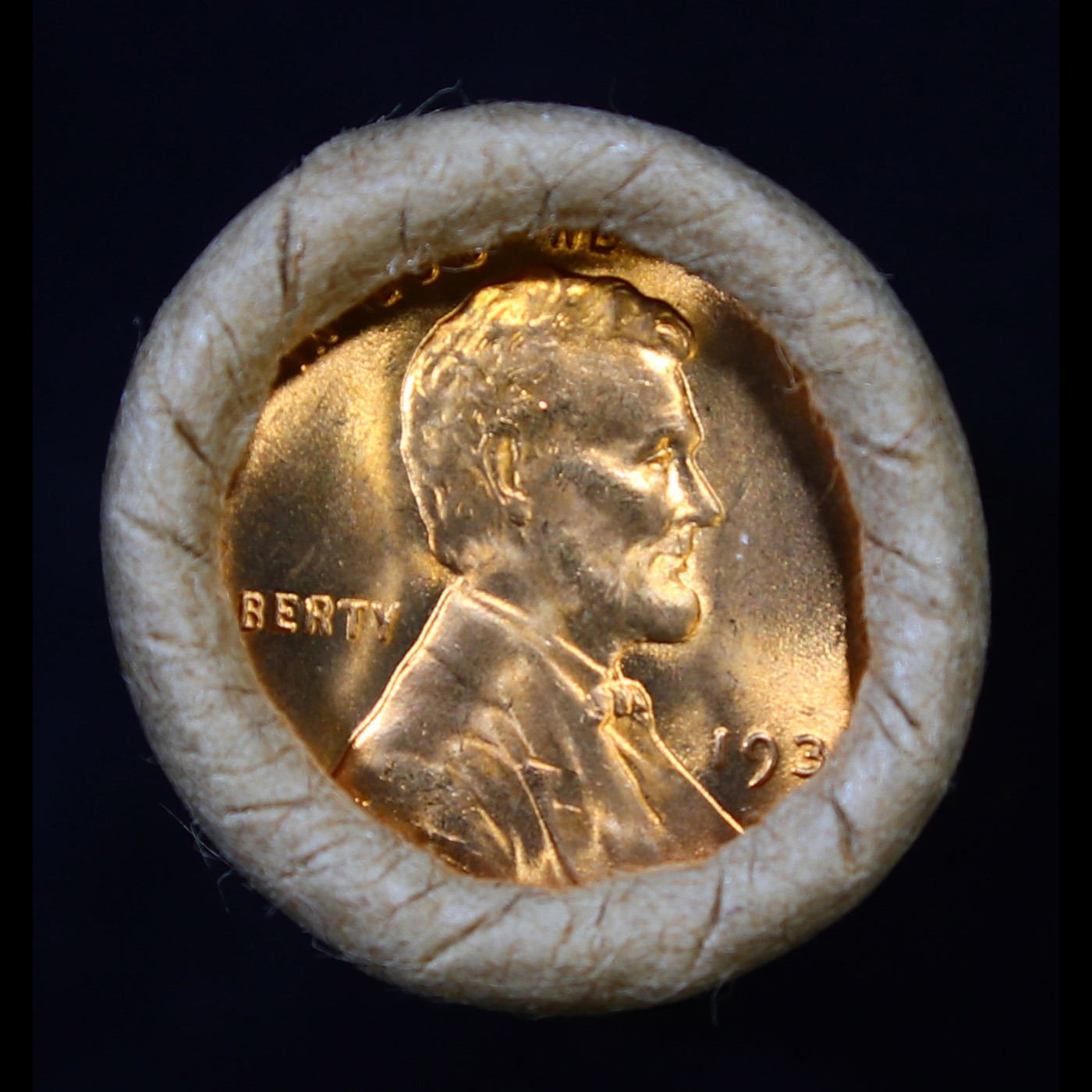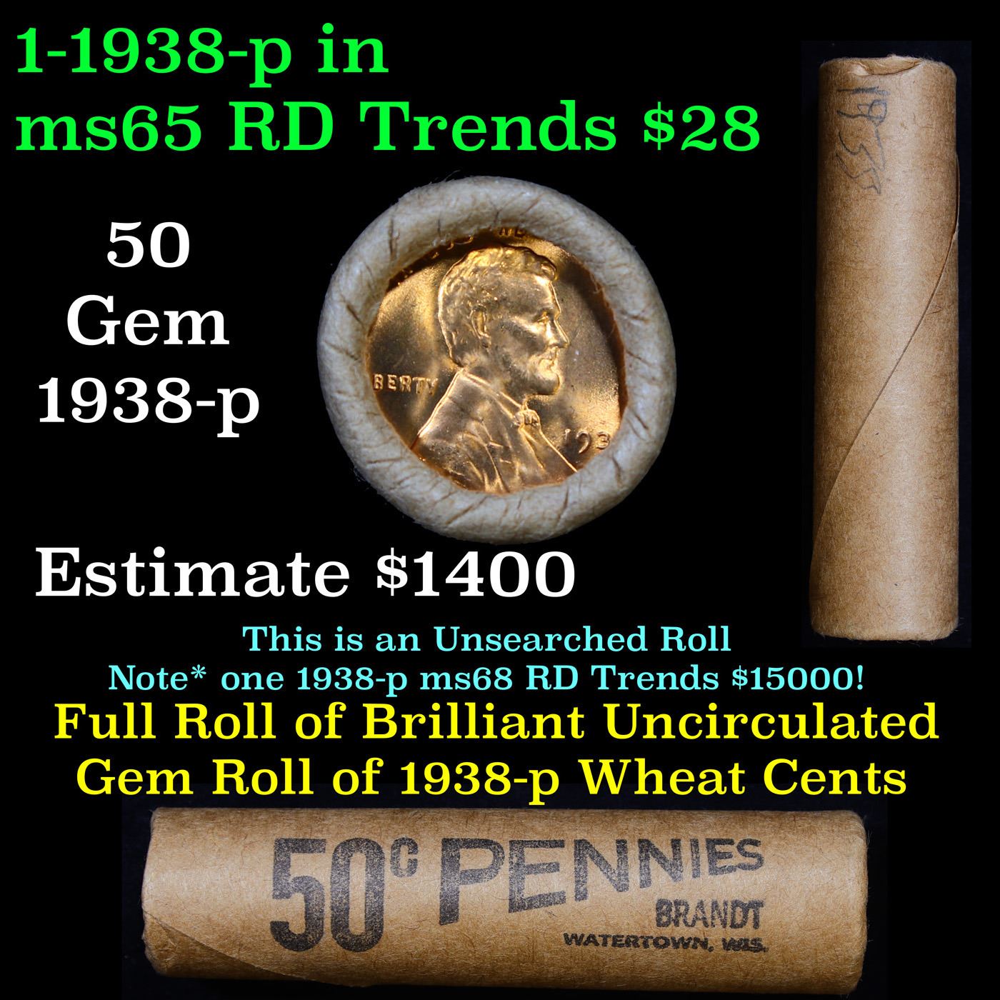 Shotgun Lincoln 1c roll, 1938-p 50 pcs Brandt Wrapper. A terrific orig shotgun roll of Lincoln cents. All coins cherry red.. Trends ms65 rd $28 Estimate $1400