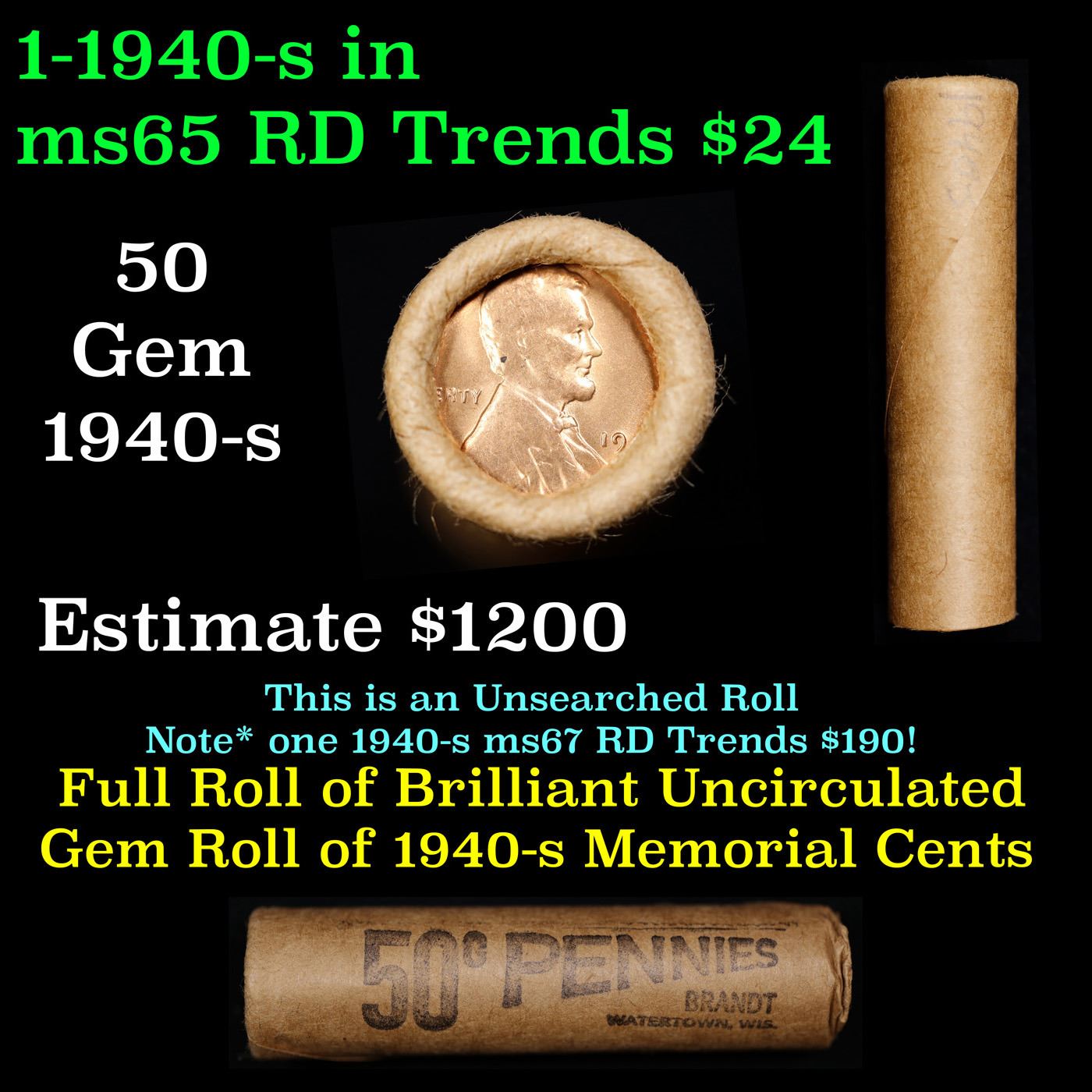 Shotgun Lincoln 1c roll, 1940-s 50 pcs Brandt Wrapper.. A terrific Shotgun roll of Lincoln cents. Most if not all coin should be cherry red.