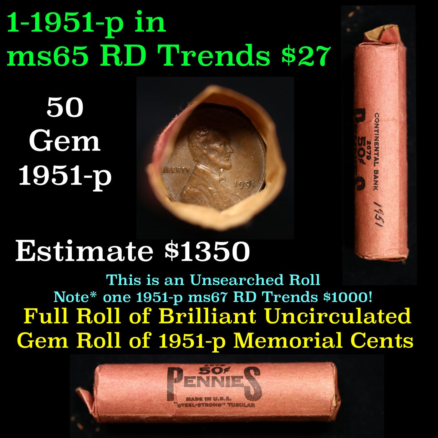 Shotgun Lincoln 1c roll, 1951-p 50 pcs Brandt Wrapper.