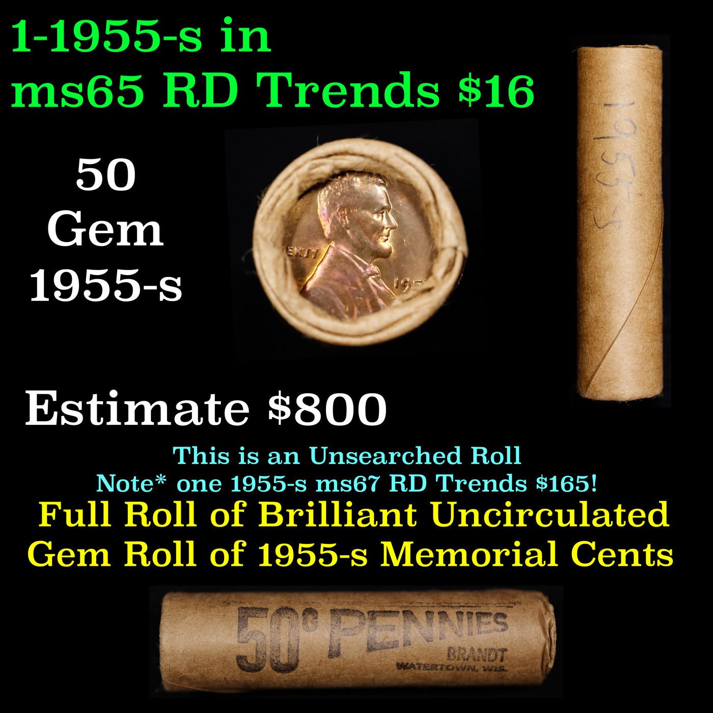 Shotgun Lincoln 1c roll, 1955-s 50 pcs Brandt Wrapper.. A terrific Shotgun roll of Lincoln cents. Most if not all coin should be cherry red.