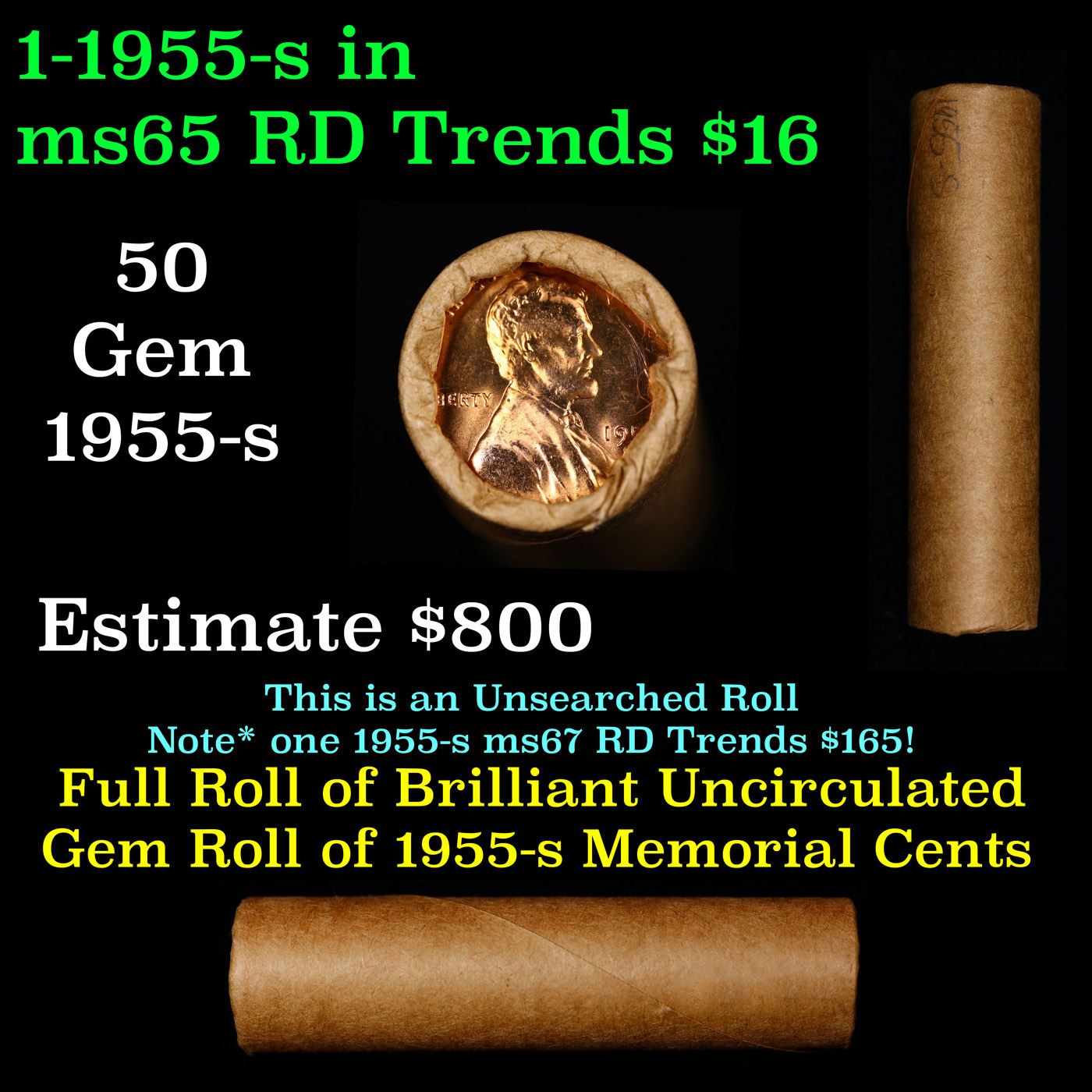 Shotgun Lincoln 1c roll, 1955-s 50 pcs Brandt Wrapper.. A terrific Shotgun roll of Lincoln cents. Most if not all coin should be cherry red.