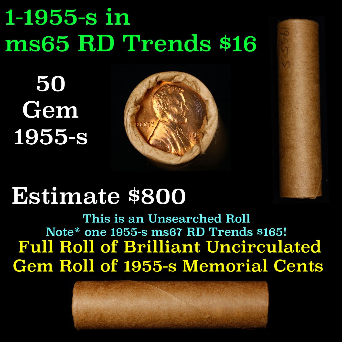 Shotgun Lincoln 1c roll, 1955-s 50 pcs Brandt Wrapper.. A terrific Shotgun roll of Lincoln cents. Most if not all coin should be cherry red.