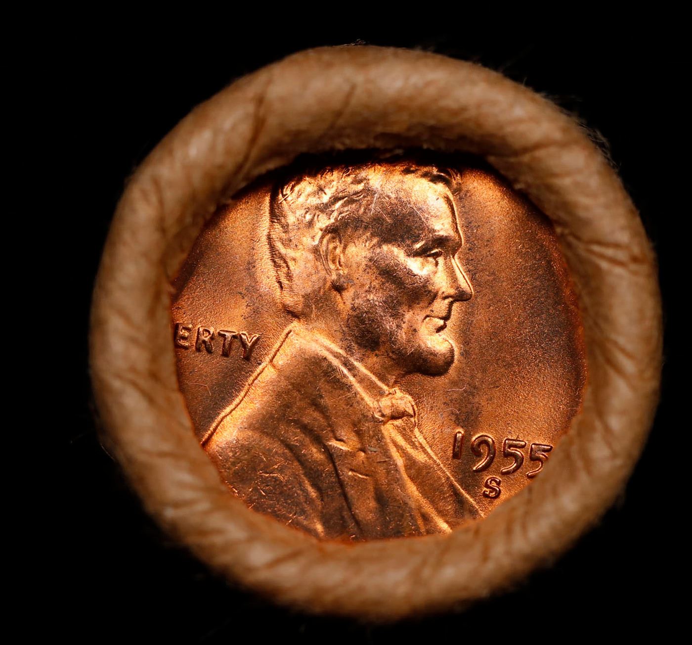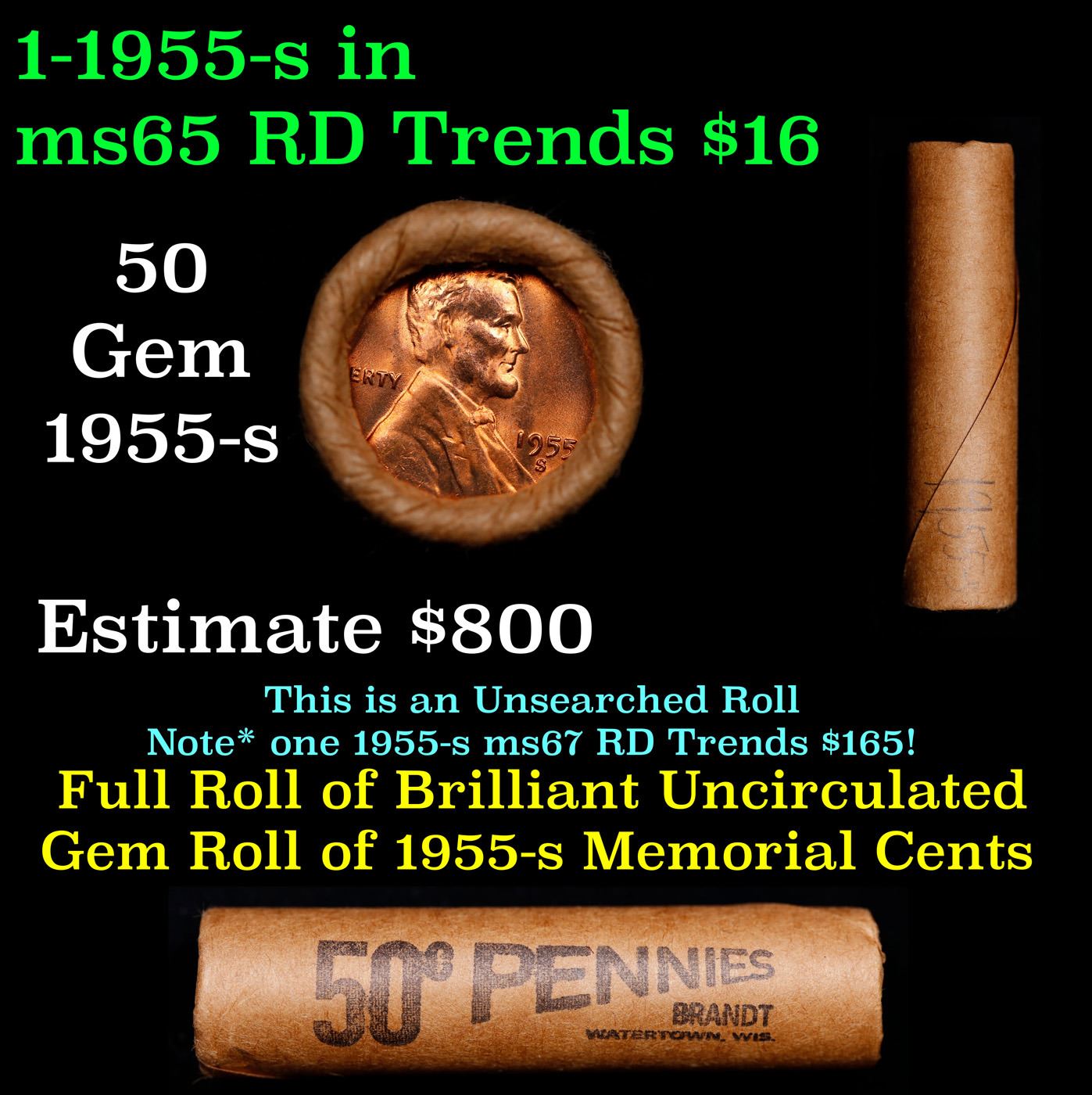 Shotgun Lincoln 1c roll, 1955-s 50 pcs Brandt Wrapper.. A terrific Shotgun roll of Lincoln cents. Most if not all coin should be cherry red.
